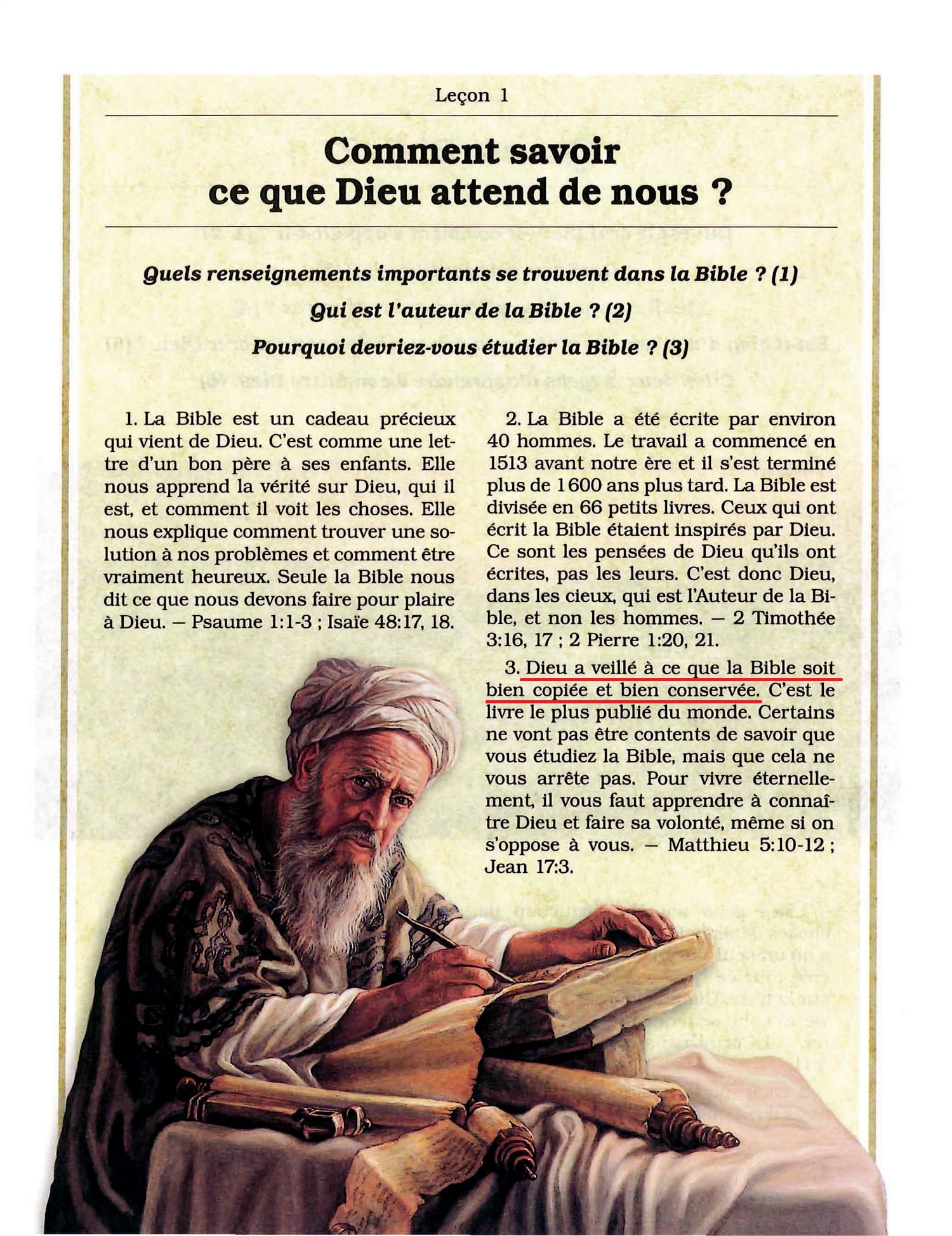 La vraie religion se reconnait aussi à la place importante qu'elle donne à la Parole de Dieu, imitant sous ce rapport l'exemple de Jésus. Elle croit fermement que "toute Ecriture est inspirée de Dieu et utile pour enseigner, pour reprendre, pour redresser les choses". (II Tim.3:16.) Parconséquent, elle se distingue tout particulièrement par son oeuvre d'enseignement de la Parole de Dieu.