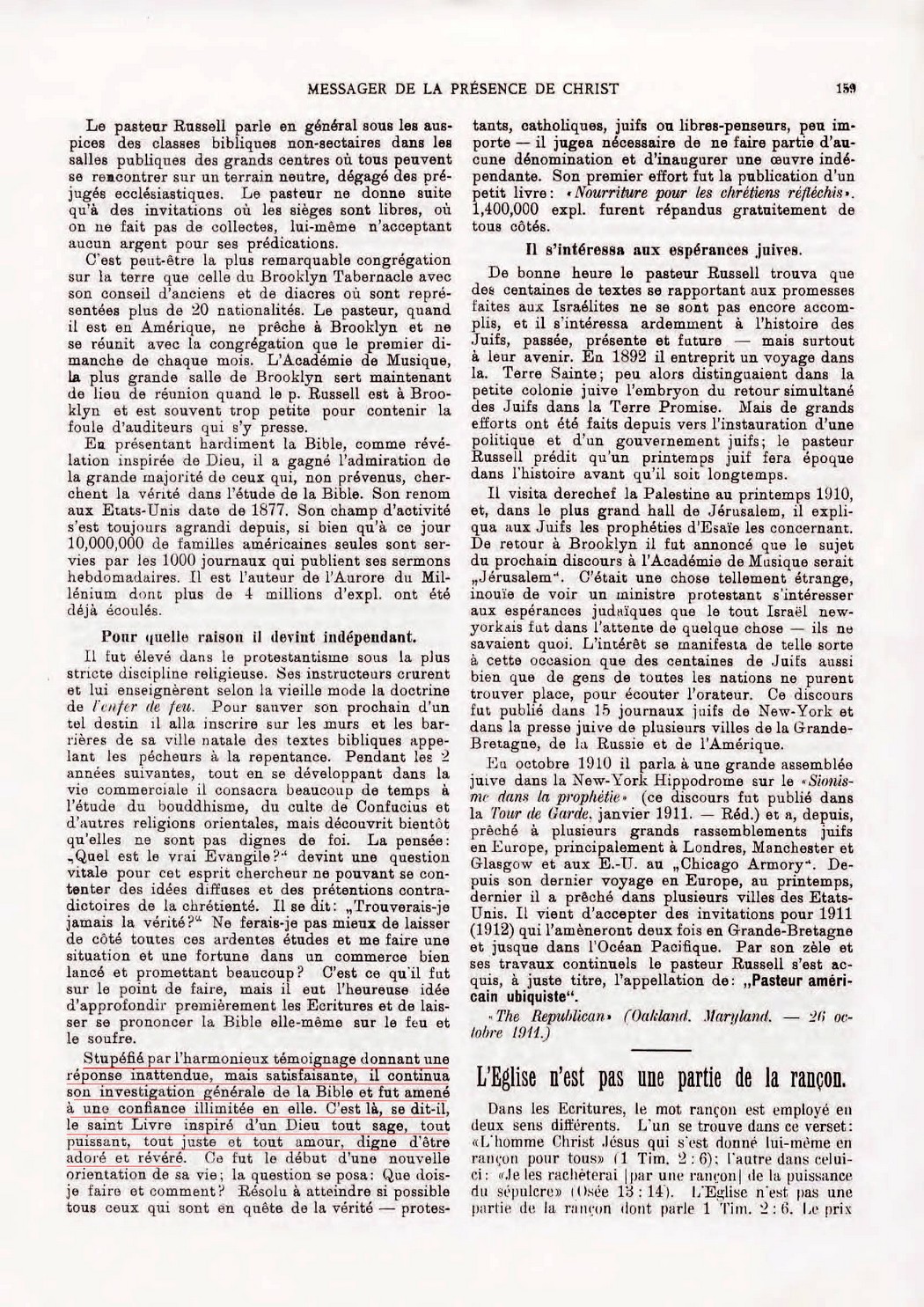 Stupéfié par l'harmonieux témoignage donnant une réponse inattendue, mais satisfaisante, il (Russell) continua son investigation générale de la Bible et fut amené à une confiance illimitée en elle. C'est là, se dit-il, le saint Livre inspiré d'un Dieu tout sage, tout puissant, tout juste et tout amour, digne d'être adoré et révéré.