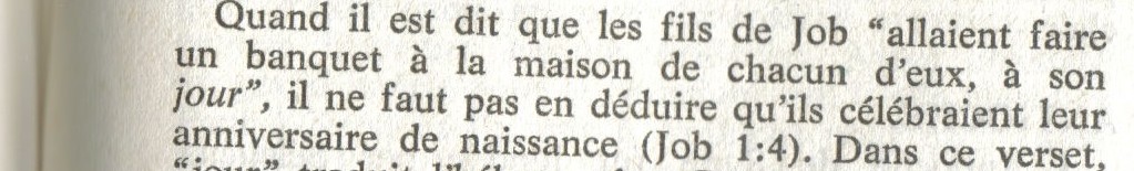 Quand il est dit que les fils de Job " allaient faire un banquet à la maison de chacun d'eux, à son jour", il ne faut pas en déduire qu'ils célébraient leur anniversaire de naissance (Job 1:4).