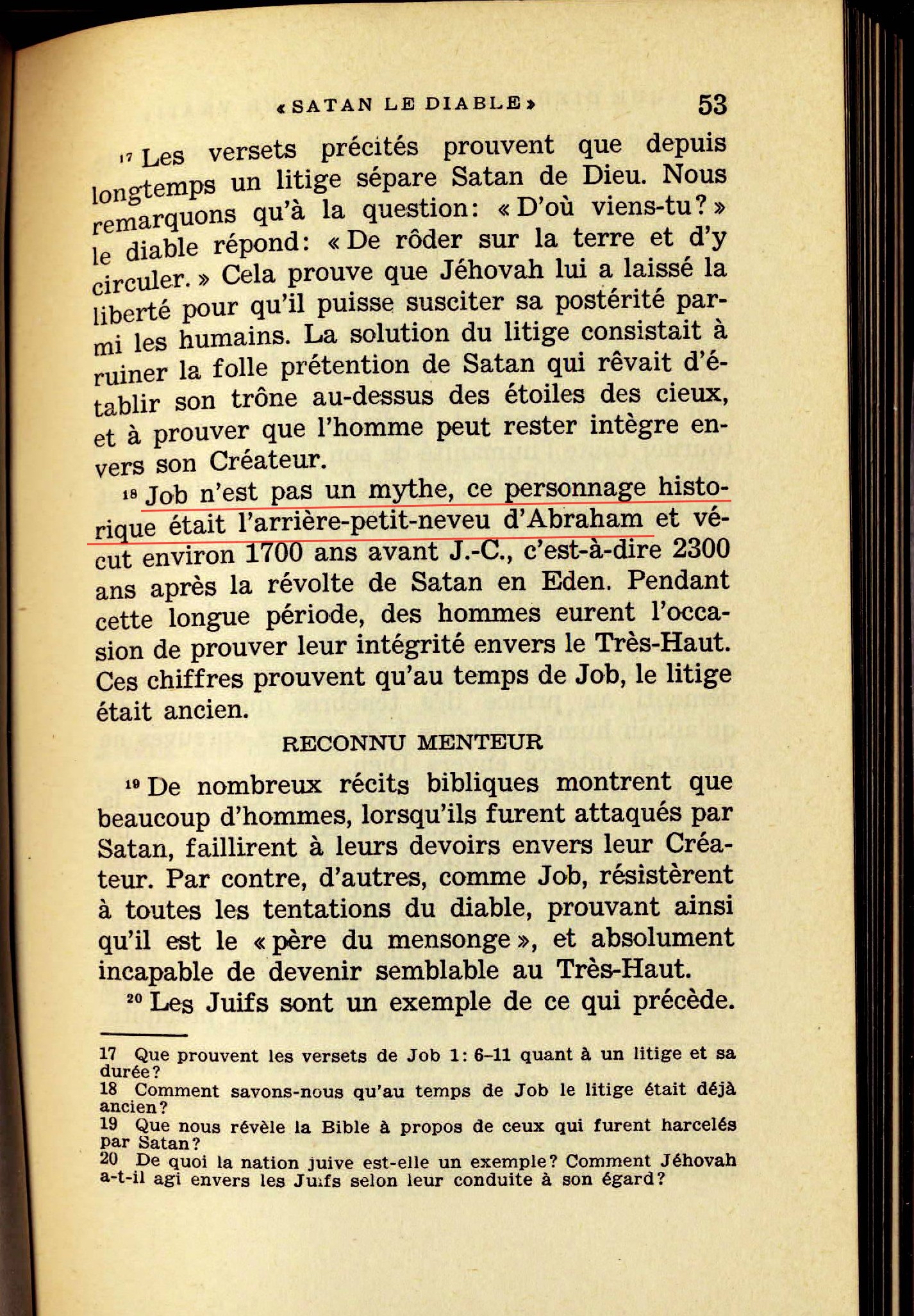 Job n'est pas un mythe, ce personnage historique était l'arrière-petit-neveu d'Abraham et vécut environ 1700 ans avant Jésus-Christ, c'est-à-dire 2300 ans après la révolte de Satan en Eden.