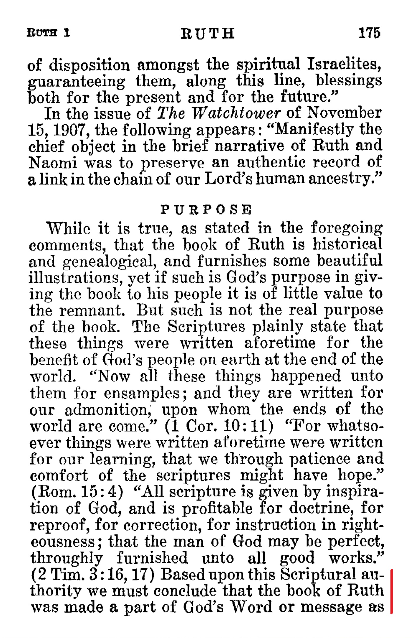 [...] Not only is the book historical, but it is prophetic, the fulfilment of wich prophecy takes place in these present days, and it is therefore present truth and food convenient for God's anointed people. [...] Based upon this Scriptural authority we must conclude that the book of Ruth was made a part of God’s Word or message as a prophecy for the special benefit of the remnant in the last days. The physical facts that have come to pass in recent years fully support that conclusion, and this is the best means of determining that the book is a prophecy. Source : 🇺🇸 Préservation, 1932, page 169 + page 175 + page 176 + Cover |