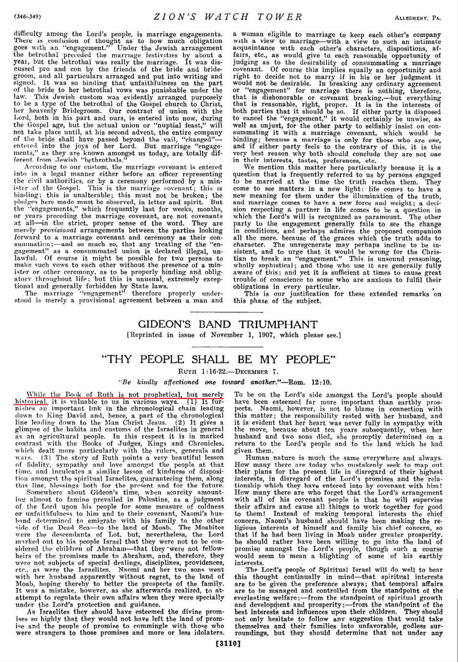 🇫🇷 Traduction : Non seulement le livre est historique, mais il est prophétique, l'accomplissement de la prophétie se déroule aujourd'hui, et présente la vérité et la nourriture convenables pour le peuple oint de Dieu. [...] Sur la base de cette autorité biblique, nous devons conclure que le livre de Ruth est devenu une partie de la Parole ou du message de Dieu en tant que prophétie au bénéfice spécial du reste des derniers jours. Les faits physiques qui se sont produits ces dernières années appuient pleinement cette conclusion, et c'est le meilleur moyen de déterminer que le livre est une prophétie.