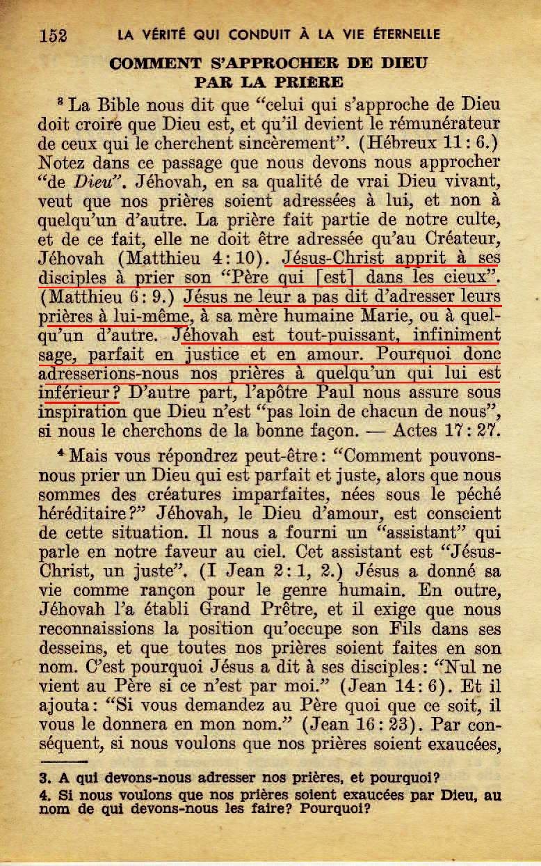 Jésus-Christ apprit à ses disciples à prier son Père qui est dans les cieux. (Matthieu 6:9). Jésus ne leur a pas dit d'adresser leurs prières à lui-même... Jéhovah est tout-puissant, infiniment sage, parfait en justice et en amour. Pourquoi donc adresserions-nous nos prières à quelqu'un qui lui est inférieur ?