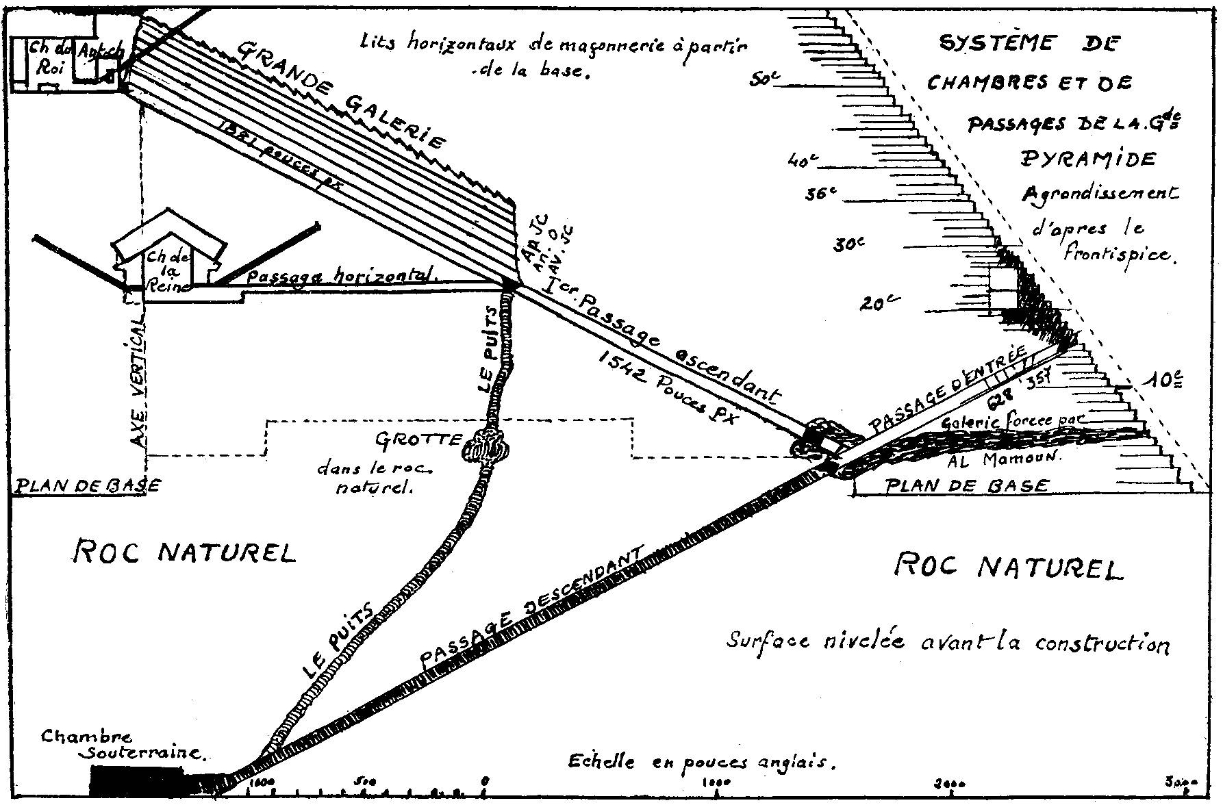 Des années avant la suggestion que la « Grande Galerie » représente la dispensation chrétienne, le professeur Smyth avait, par l'observation astronomique, fixé la date de la construction de la Grande Pyramide à l'an 2170 avant J.-C. Lorsque M. Menzies suggéra l'idée que les pouces mesurés le long de la rampe de la « Grande Galerie » représentent des années, quelqu'un pensa : Si cette théorie était vraie, le mesurage de la rampe, à partir de l'extrémité inférieure de la « Grande Galerie », en descendant le « Premier Passage Ascendant », jusqu'à son intersection avec le « Passage d'Entrée » et de là en remontant vers l'entrée de la Pyramide devrait révéler quelque marque ou indication démontrant l'exactitude de la date de la construction de la Pyramide et de la théorie du pouceannée. Cette idée assez raisonnable constituait une épreuve décisive. Un ingénieur civil fut chargé de mesurer très exactement les passages, les chambres, etc., de la Pyramide. C'était en 1872. L'expertise de cet ingénieur vint confirmer cette idée au suprême degré; les mesures prises le long de la rampe montrèrent que le parcours ci-dessus indiqué était de 2170 pouces jusqu'à une ligne finement tracée à la règle dans les parois du « Passage d'Entrée » C» ). La date de sa construction est ainsi doublement attestée, tandis que les longueurs de ses passages constituent des documents (« scrolls ») d'histoire et de chronologie que l'on recevra encore généralement comme « un Témoignage pour l'Eternel au milieu du pays d'Egypte ». Grâce aux mesurages très précis de tous les passages, fournis par le professeur ,Smyth, nous sommes rendus capables de discerner les traits les plus intéressants du témoignage jusqu'ici révélé de ce « Témoin ».