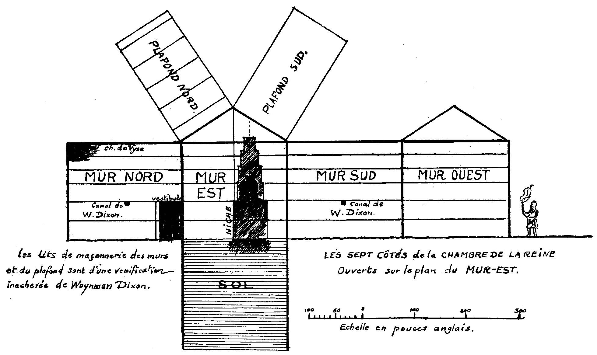 A l'extrémité supérieure ou sud de la « Grande Galerie » le sol de l' « Antichambre » et de la « Chambre du Roi » se prolonge jusque dans la « Grande Galerie », et y forme une sorte de barrière abrupte ou de gradin élevé qui s'avance de soixante et un pouces à l'intérieur de la Galerie, à son extrémité supérieure. Cette paroi sud présente une particularité : elle n'est pas verticale, mais inclinée dans la direction du nord, à vingt et un pouces [20 d'après Dr. J. Edgar] au sommet. A son sommet même, se trouve un orifice ou passage qui conduit aux « Chambres de Construction » situées au-dessus de la « Chambre du Roi ».