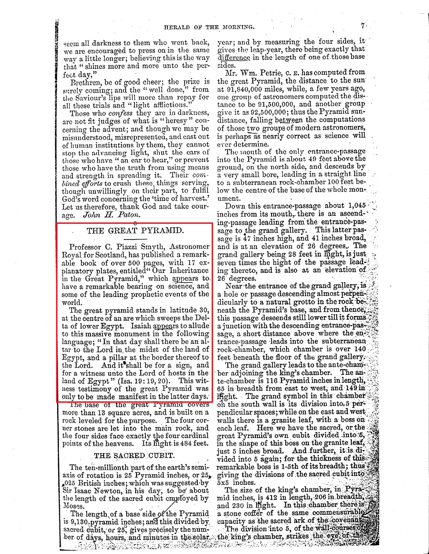 The Great Pyramid stands in latitude 30, at the center of an area which sweeps the Delta of lower Egypt. Isaiah appears to allude to this massive monument in the following language; "In that day shall there be an altar to the Lord in the midst of the land of Egypt, and a pillar at the border thereof to the Lord. And it shall be for a sign, and for a witness unto the Lord of hosts in the land of Egypt" (Isa 19:19, 20). This witness testimony of the Great Pyramid was only to be made manifest in the latter days. Source : 🇺🇸 1876 - Herald of the Morning, 01 January 1876, page 7 + Cover + PDF |