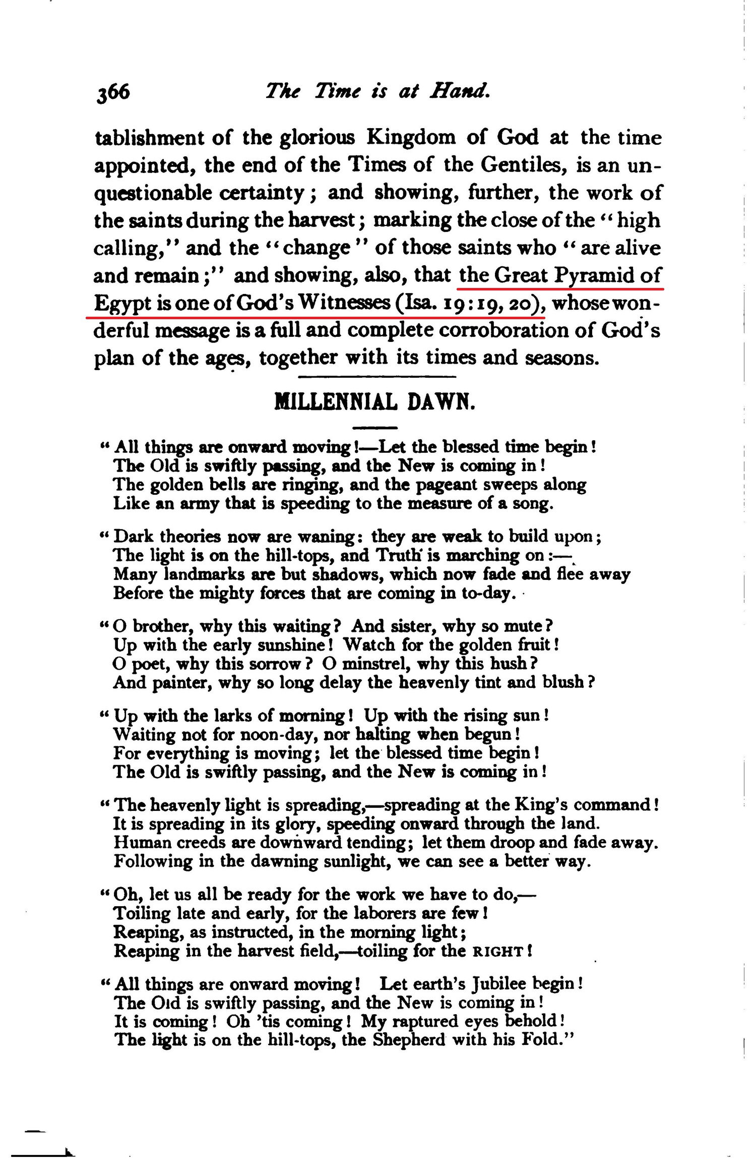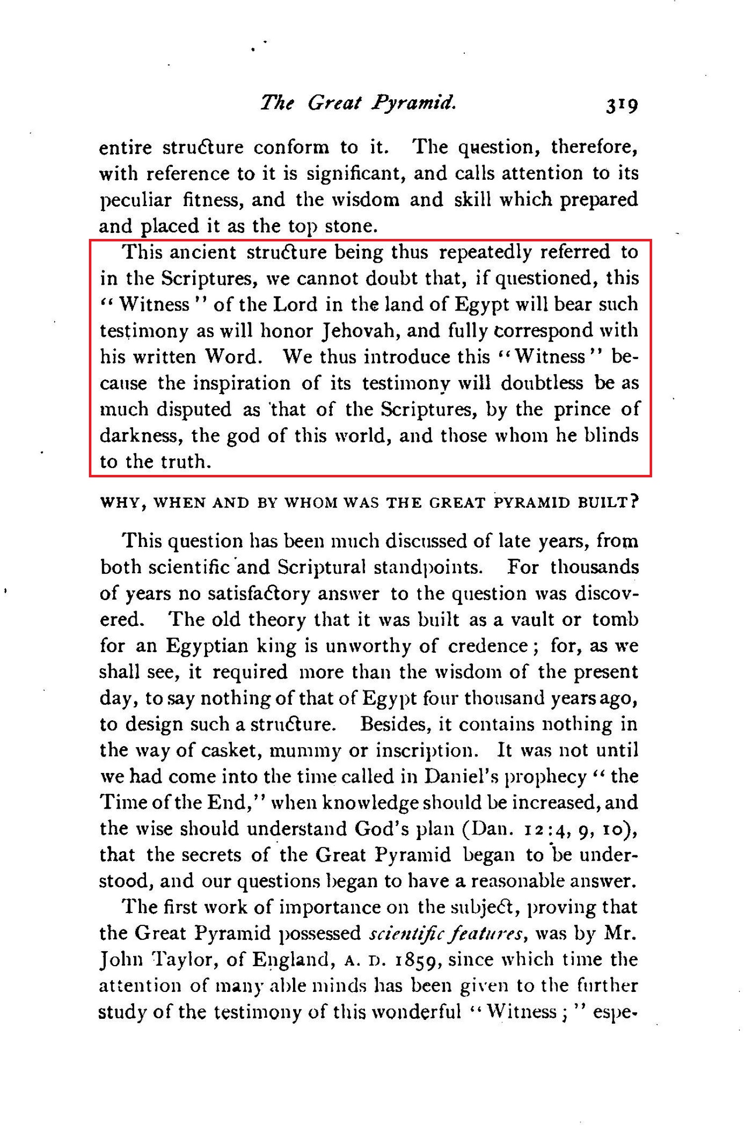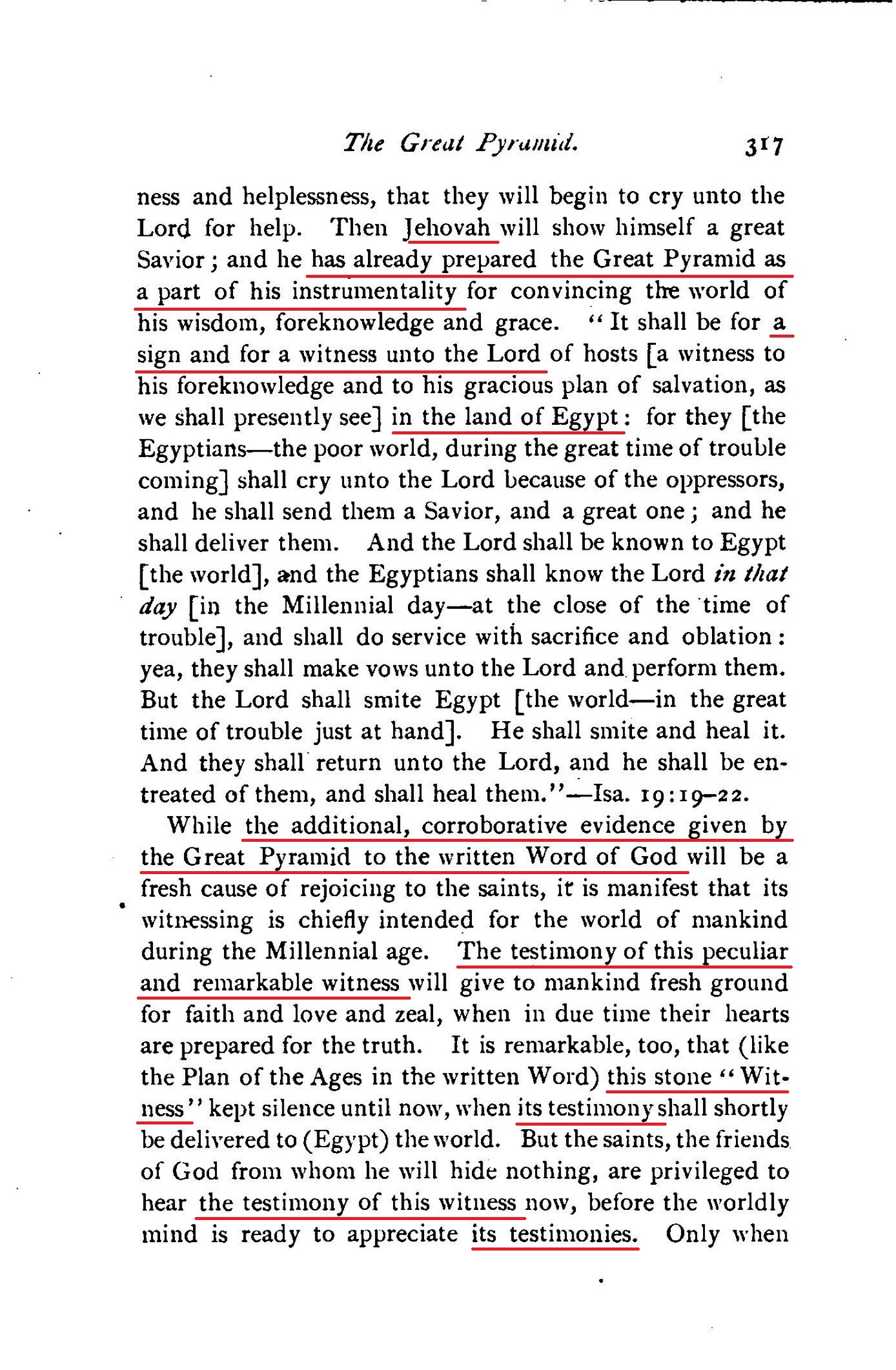 [...] and showing, also, that the Great Pyramid of Egypt is one of God's Witnesses (Isa. 19:19-20), whose wonderful message is a full and complete corroboration of God's plan of the ages, together with its times and seasons.
