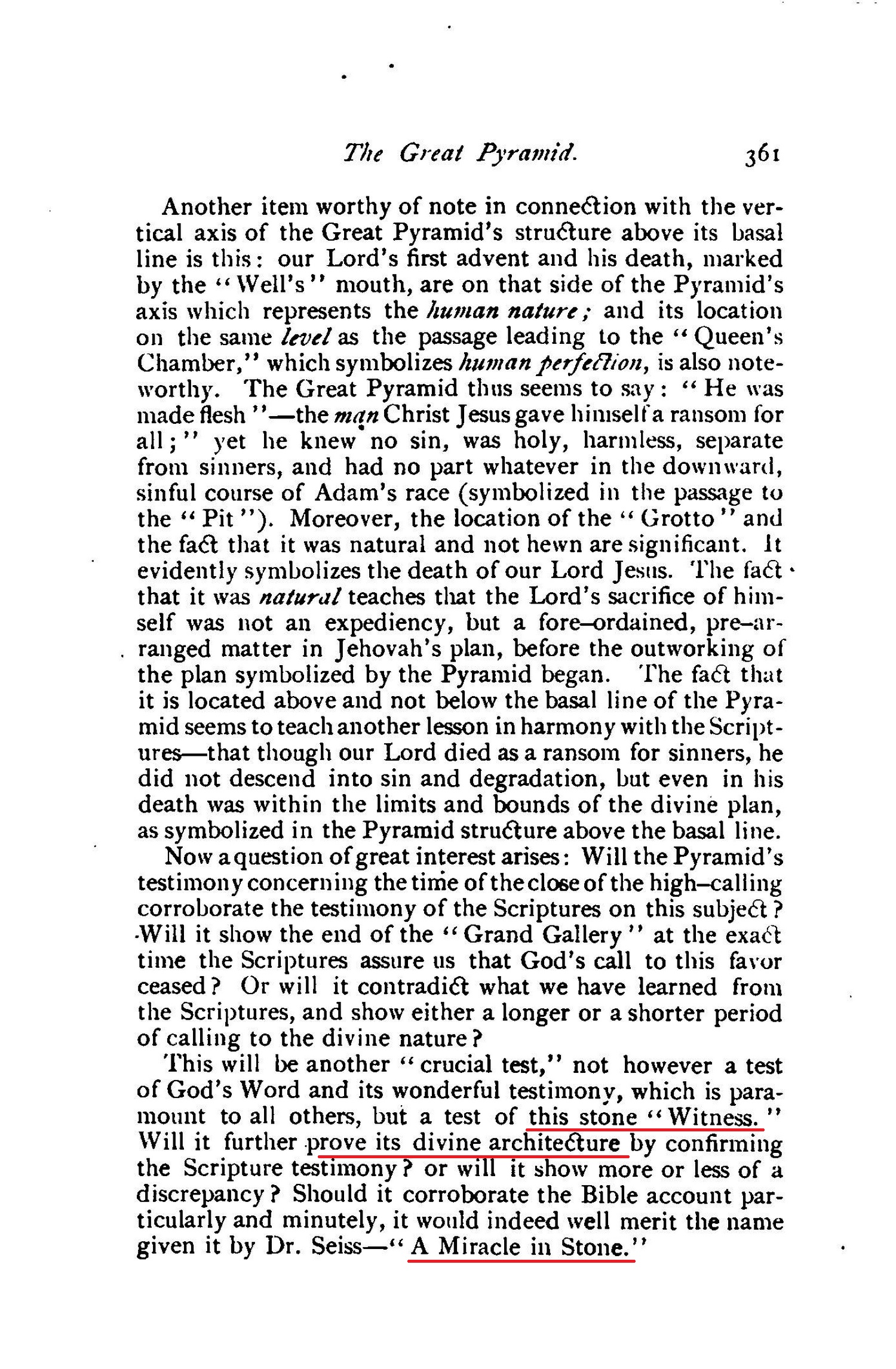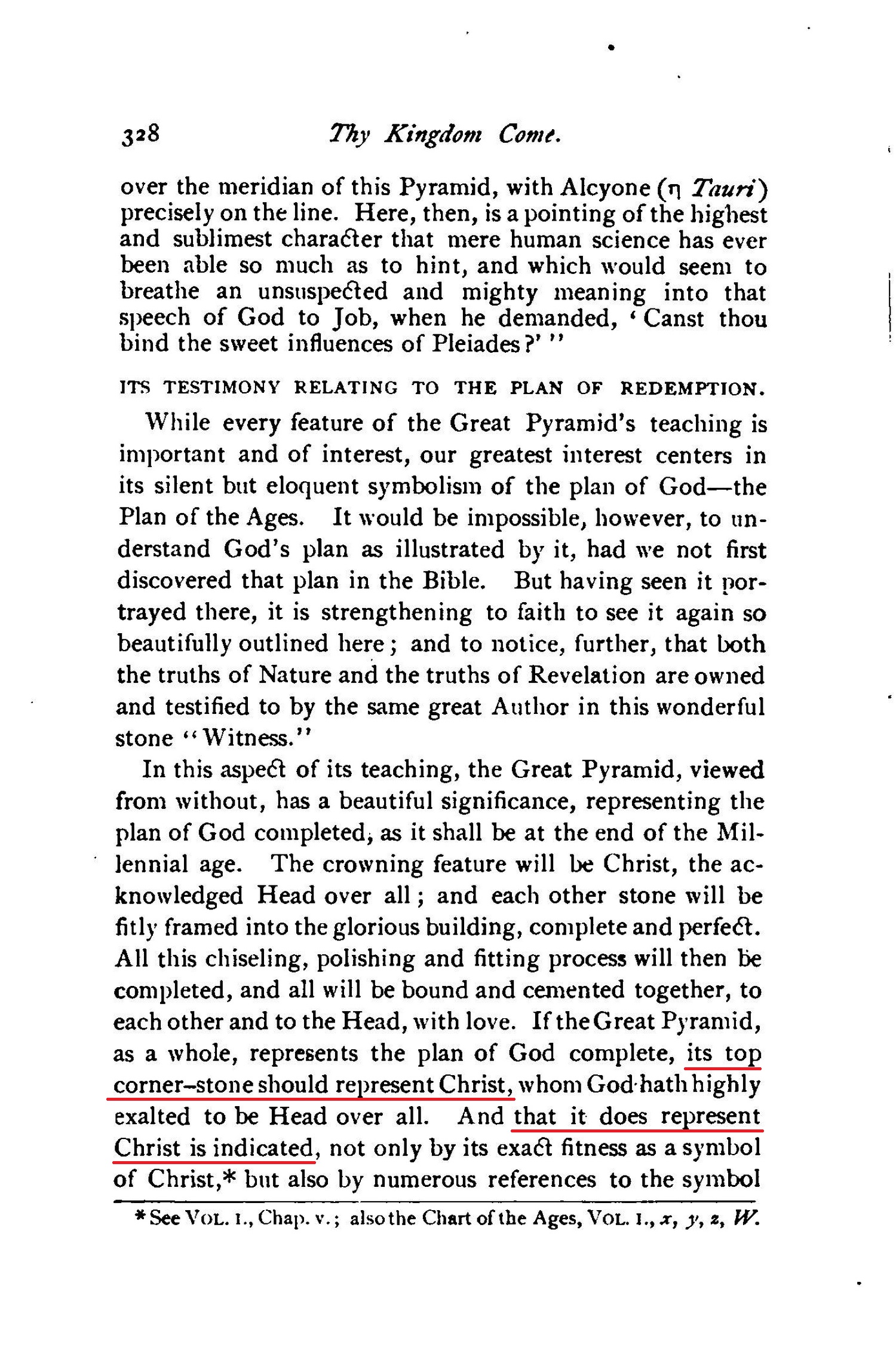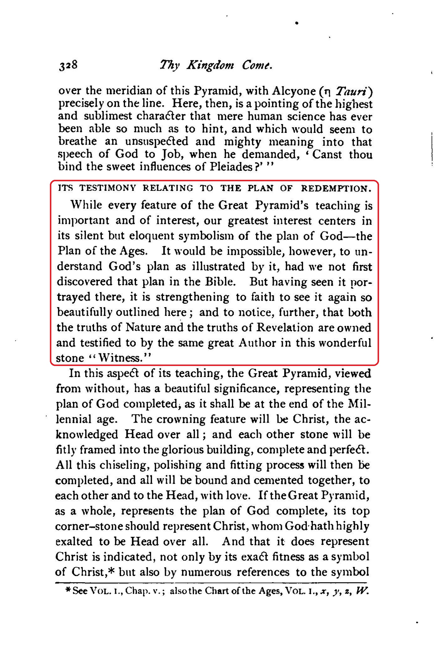 [...] and showing, also, that the Great Pyramid of Egypt is one of God's Witnesses (Isa. 19:19-20), whose wonderful message is a full and complete corroboration of God's plan of the ages, together with its times and seasons.