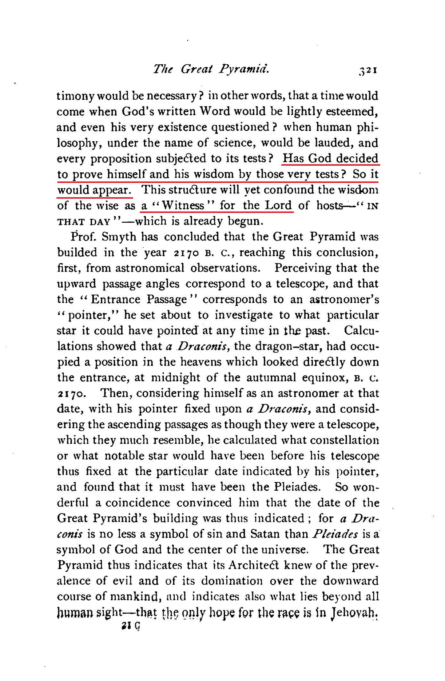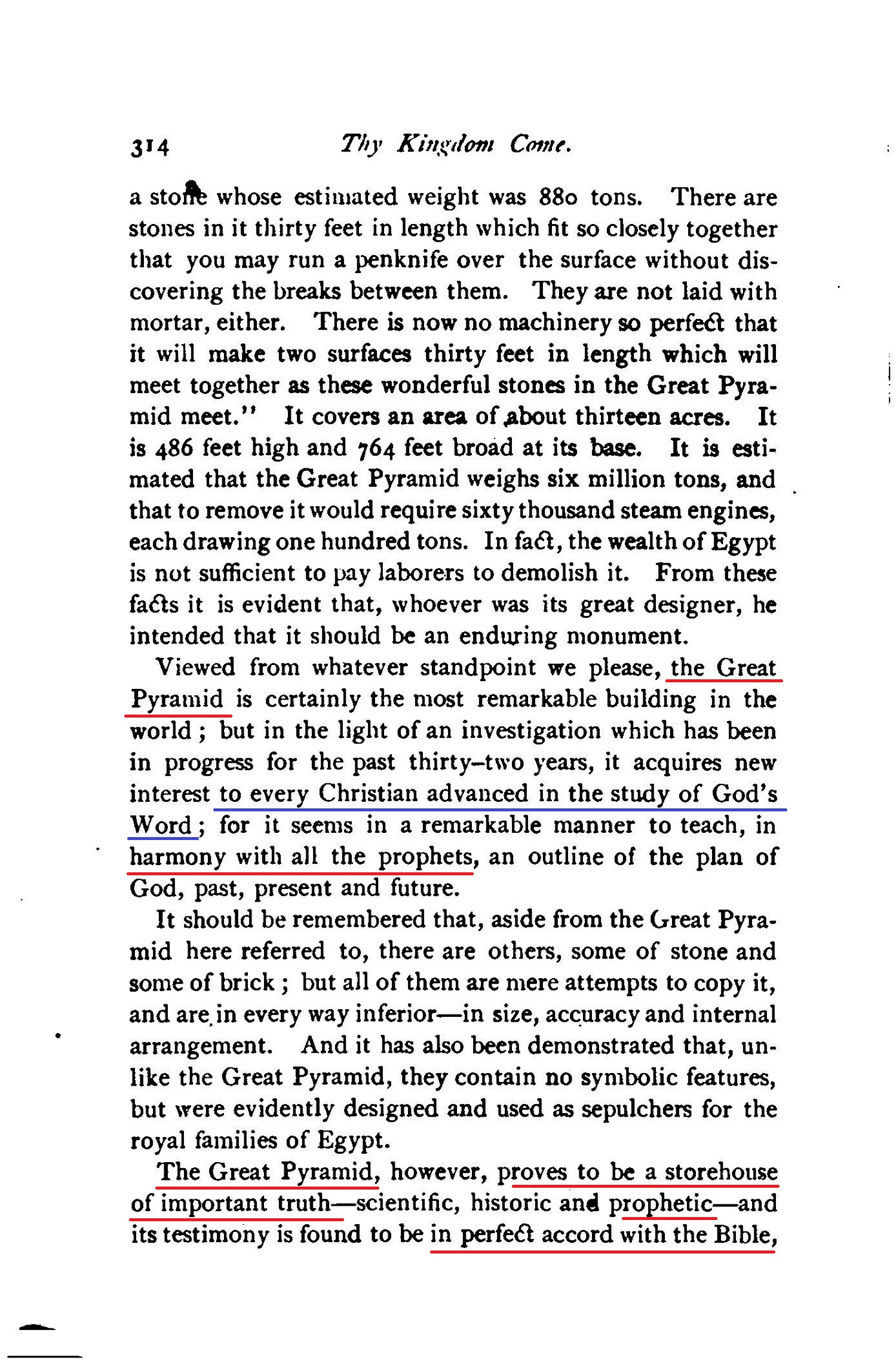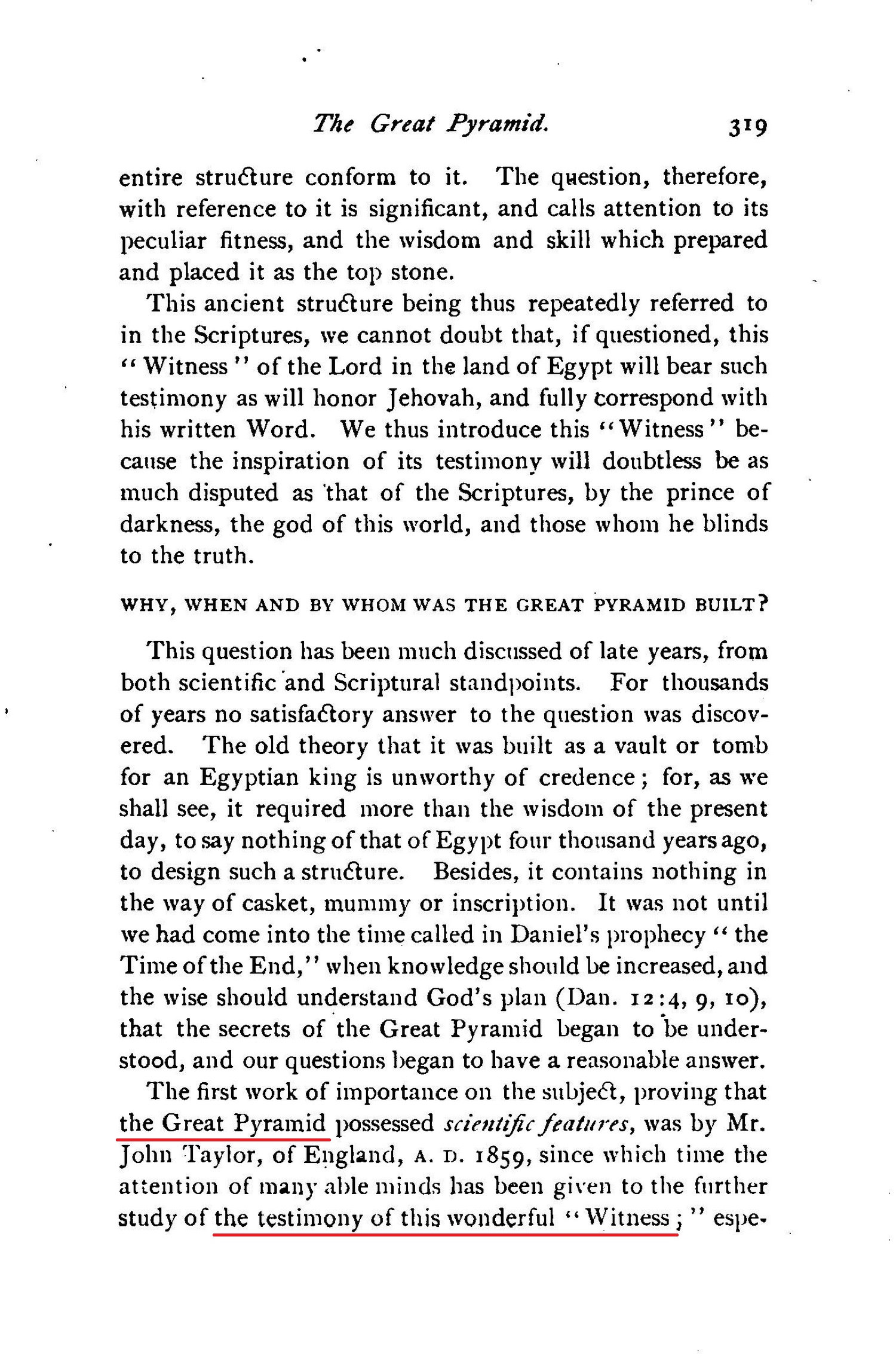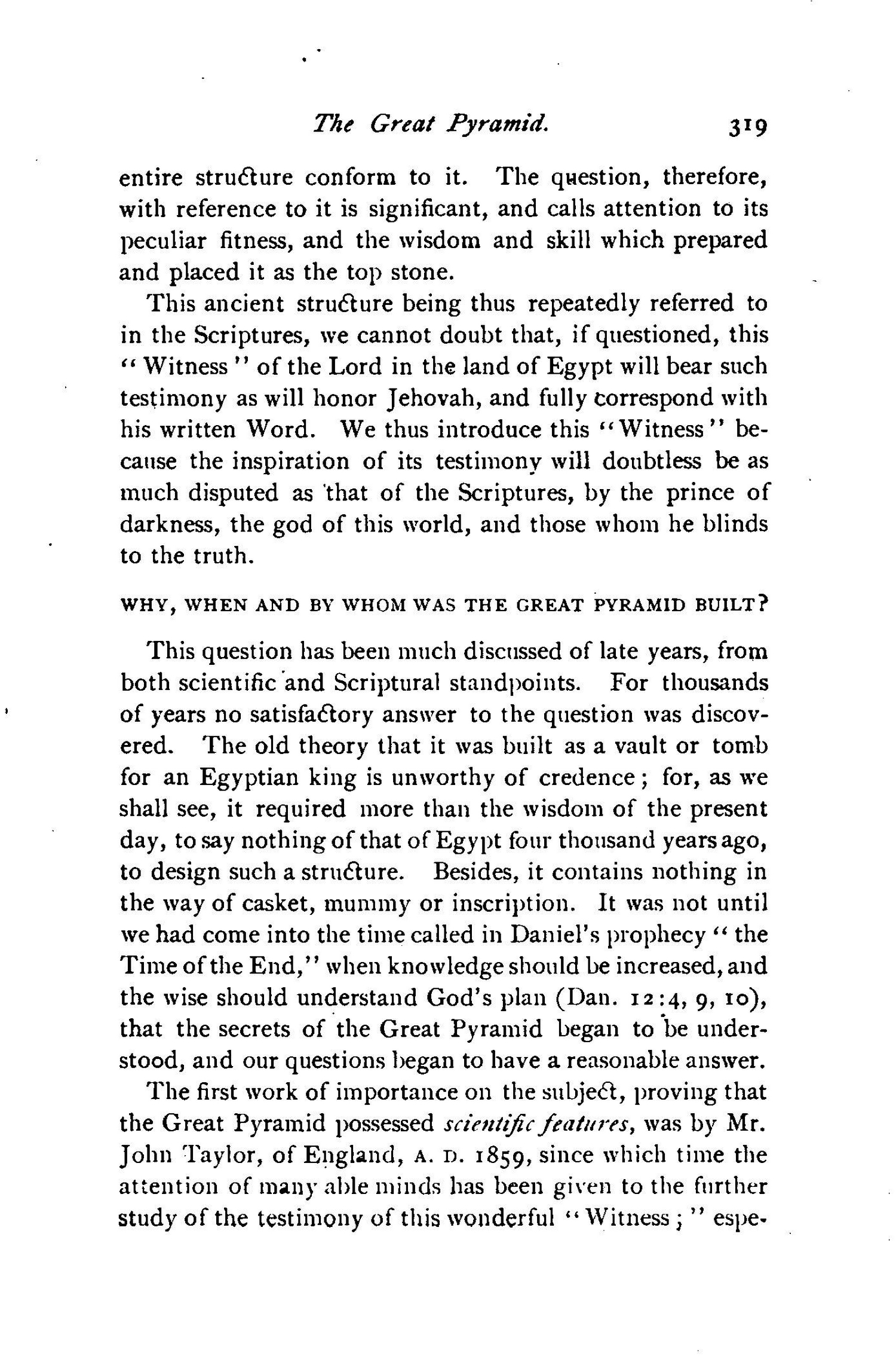 [...] THE GREAT PYRAMID A STOREHOUSE OF TRUTH - SCIENTIFIC, HISTORIC AND PROPHETIC. - BIBLE ALUSSIONS TO IT. - WHY, WHEN AND BY WHOM BUILT. - IMPORTANCE OF ITS LOCATION. - ITS SCIENTIFIC LESSON. - ITS TESTIMONY CONCERNING THE PLAN OF REDEMPTION - THE PLAN OF THE AGES. - THE DEATH AND THE RESURRECTION OF CHRIST INDICATED. [...] DATE OF THE SECOND ADVENT OF CHRIST. [...] "In that day shall there be an altar to the Lord in the midst of the land of Egypt, and a pillnr at the border thereof to the Lord. And it shall be for a sign and for a witness unto the Lord of hosts in the land of Egypt." - Isa. 19:19, 20. Source : 🇺🇸 1891 (first ed.) - Thy Kingdom Come, Studies in the Scriptures, vol. III, 1891, Chapter X, page 313 - [archive.org] |