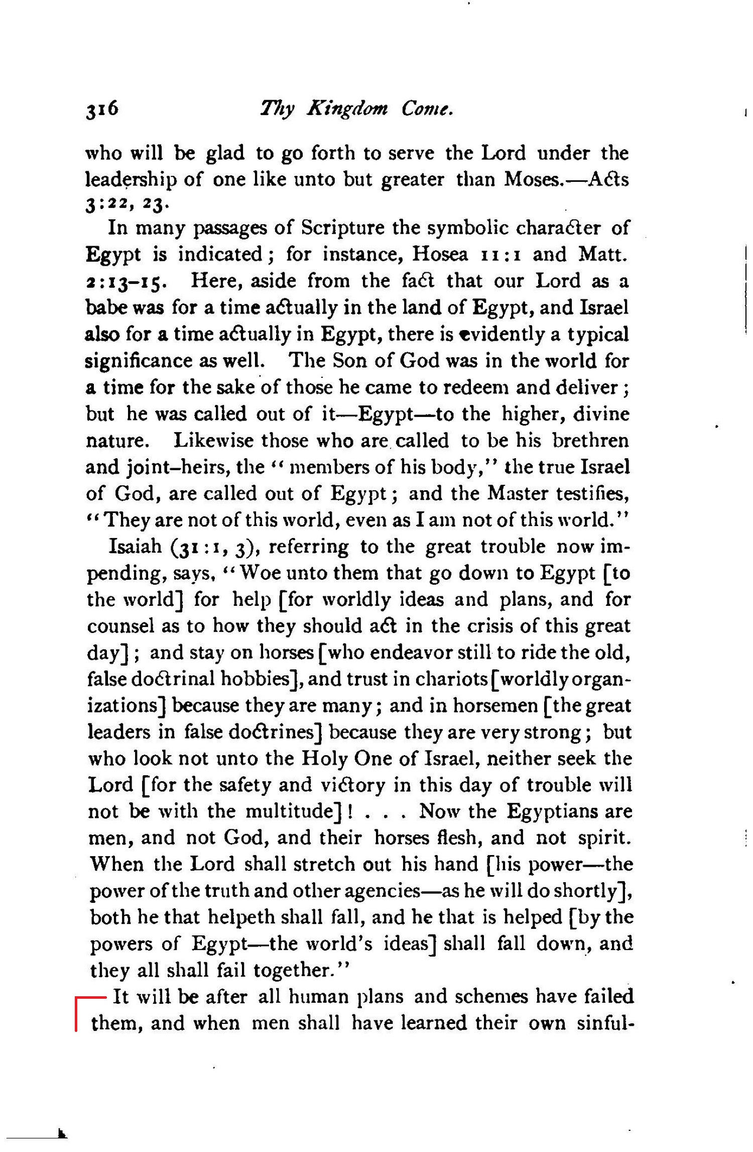 It will be after all human plans and schemes have failed them, and when men shall have learned their own sinfulness and helplessness, that they will begin to cry unto the Lord for help. Then Jehovah will show himself a great Savior; and he has already prepared the Great Pyramid as a part of his instrumentality for convincing the world of his wisdom, foreknowledge and grace. "It shall be for a sign and for a witness unto the Lord of hosts [a witness to his foreknowledge and to his gracious plan of salvation, as we shall presently see] in the land of Egypt: for they [the Egyptians-the poor world, during the great time of trouble conling] shall cry unto the Lord because of the oppressors, and he shall send them a Savior, and a great one ; and he shall deliver them. [...]