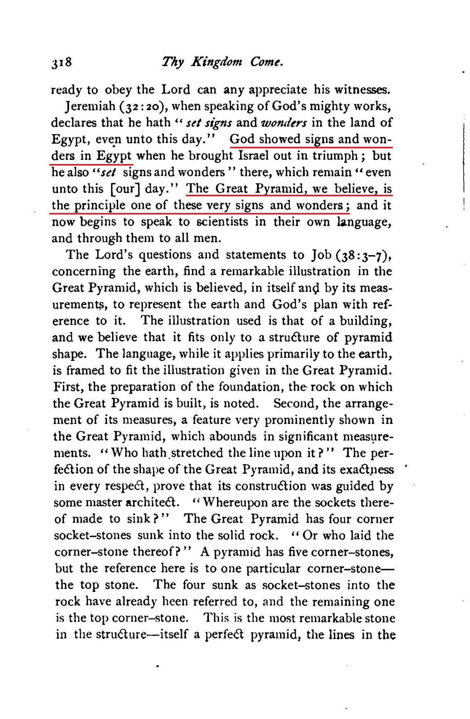 While the additional, corroborative evidence given by the Great Pyramid to the written Word of God will be a fresh cause of rejoicing to the saints, it is manifest that its witnessing is chiefly intended for the world of mankind during the Millennial age. The testimony of this peculiar and remarkable witness will give to mankind fresh ground for faith and love and zeal, when in due time their hearts are prepared for the truth. It is remarkable, too, that (like the Plan of the Ages in the written Word) this stone "Witness" kept silence until now, when its testimony shall shortly be delivered to (Egypt) the world. But the saints, the friends of God from whom he will hide nothing, are privileged to hear the testimony of this witness now, before the worldly mind is ready to appreciate its testimonies. Only when ready to obey the Lord can any appreciate his witnesses. Jeremiah (32:20), when speaking of God's mighty works, declares that he hath "set signs and wonders in the land of Egypt, even unto this day."God showed signs and wonders in Egypt when he brought Israel out in triumph; but he also "set signs and wonders" there, which remain" even unto this [our] day." The Great Pyramid, we believe, is the principle one of these very signs and wonders; and it now begins to speak to scientists in their own language, and through them to all men. Source : 🇺🇸 1891 (first ed.) - Thy Kingdom Come, Studies in the Scriptures, vol. III, 1891, Chapter X, page 316, page 317 page 318, - [archive.org] |