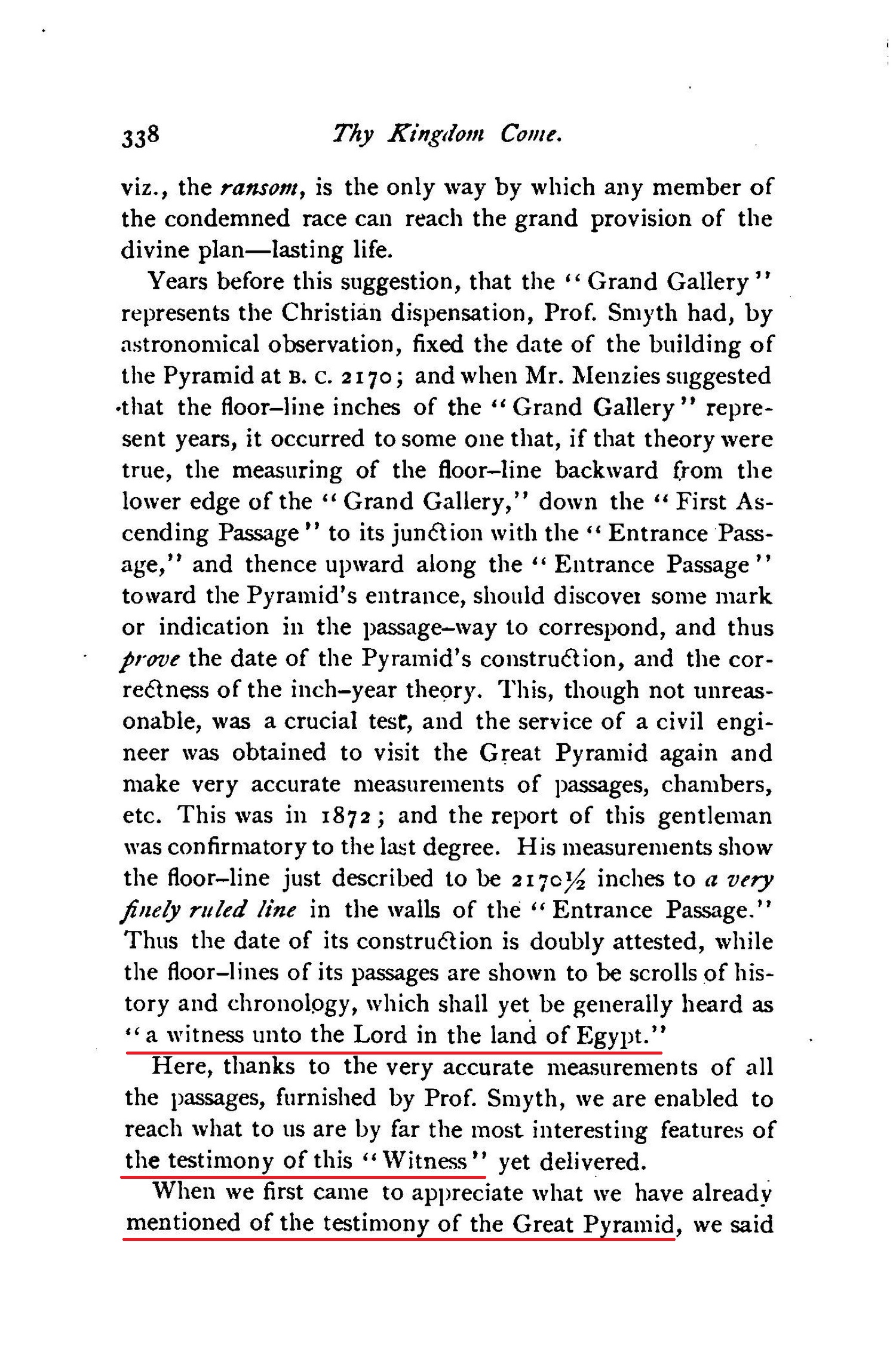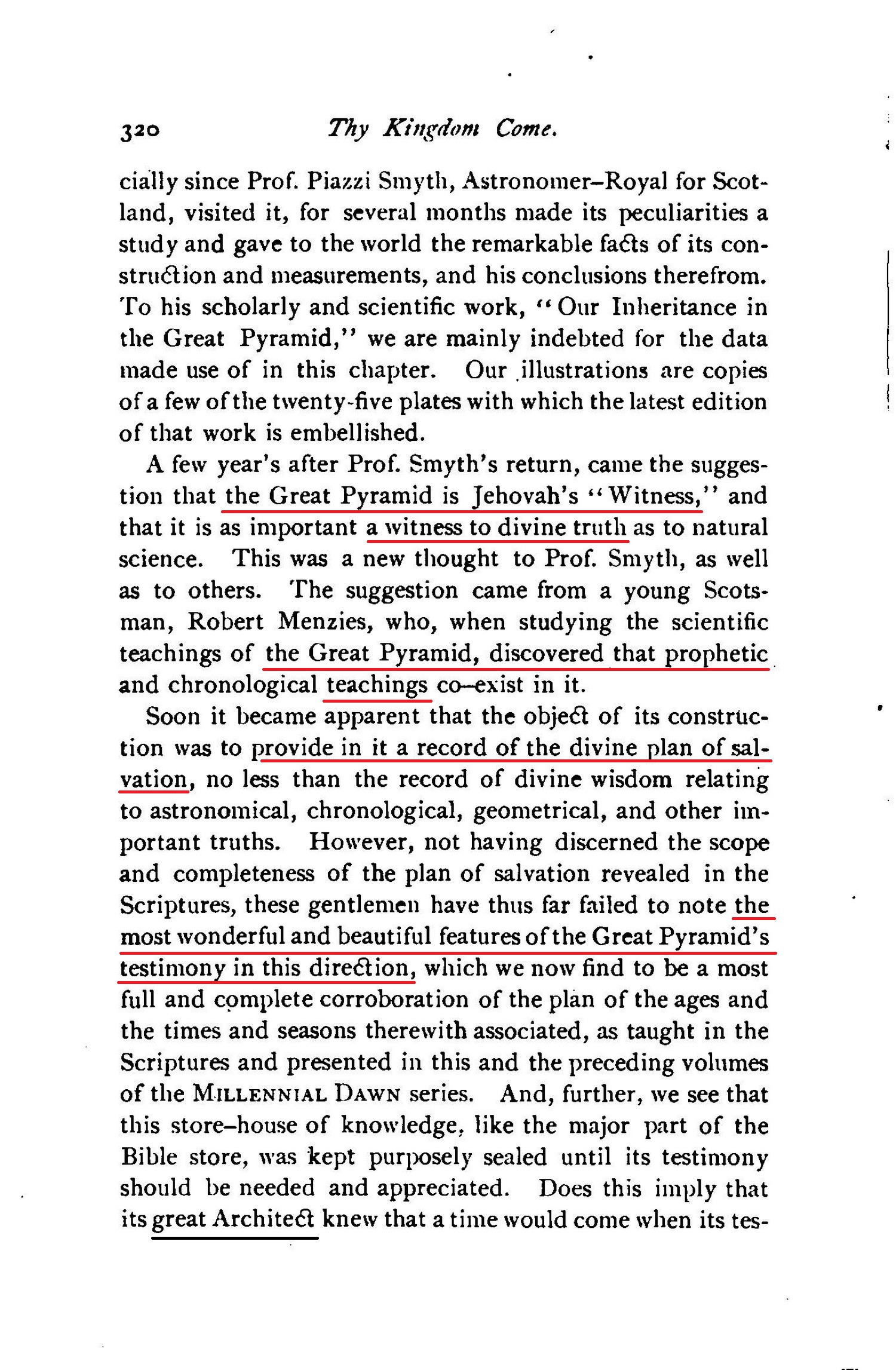 A few year's after Prof. Smyth's return, came the suggestion that the Great Pyramid is Jehovah's "Witness," and that it is as important a witness to divine truth as to natural science. This was a new thought to Prof. Smyth, as well as to others. The suggestion came from a young Scotsman, Robert Menzies, who, when studying the scientific teachings of the Great Pyramid, discovered that prophetic and chronological teachings co-exist in it. Soon it became apparent that the object of its construction was to provide in it a record of the divine plan of salvation, no less than the record of divine wisdom relating to astronomical, chronological, geometrical, and other important truths. However, not having discerned the scope and completeness of the plan of salvation revealed in the Scriptures, these gentlemen have thus far failed to note the most wonderful and beautiful features of the Great Pyramid's testimony in this direction, which we now find to be a most full and complete corroboration of the plan of the ages and the times and seasons therewith associated, as taught in the Scriptures and presented in this and the preceding volumes of the MILLENNIAL DAWN series. And, further, we see that this store-house of knowledge: like the major part of the Bible store, was kept purposely sealed until its testimony should be needed and appreciated. Does this imply that its great Architect knew that a time would come when its testimony would be necessary? in other words, that a time would come when God's written Word would be lightly esteemed, and even his very existence questioned? when human philosophy, under the name of science, would be lauded, and every proposition subjected to its tests? Has God decided to prove himself and his wisdom by those very tests? So it would appear. This structure will yet confound the wisdom of the wise as a "Witness" for the Lord of hosts- "IN THAT DAY" - which is already begun. Source : 🇺🇸 1891 (first ed.) - Thy Kingdom Come, Studies in the Scriptures, vol. III, 1891, Chapter X, page 319, page 320, page 321 - [archive.org] |