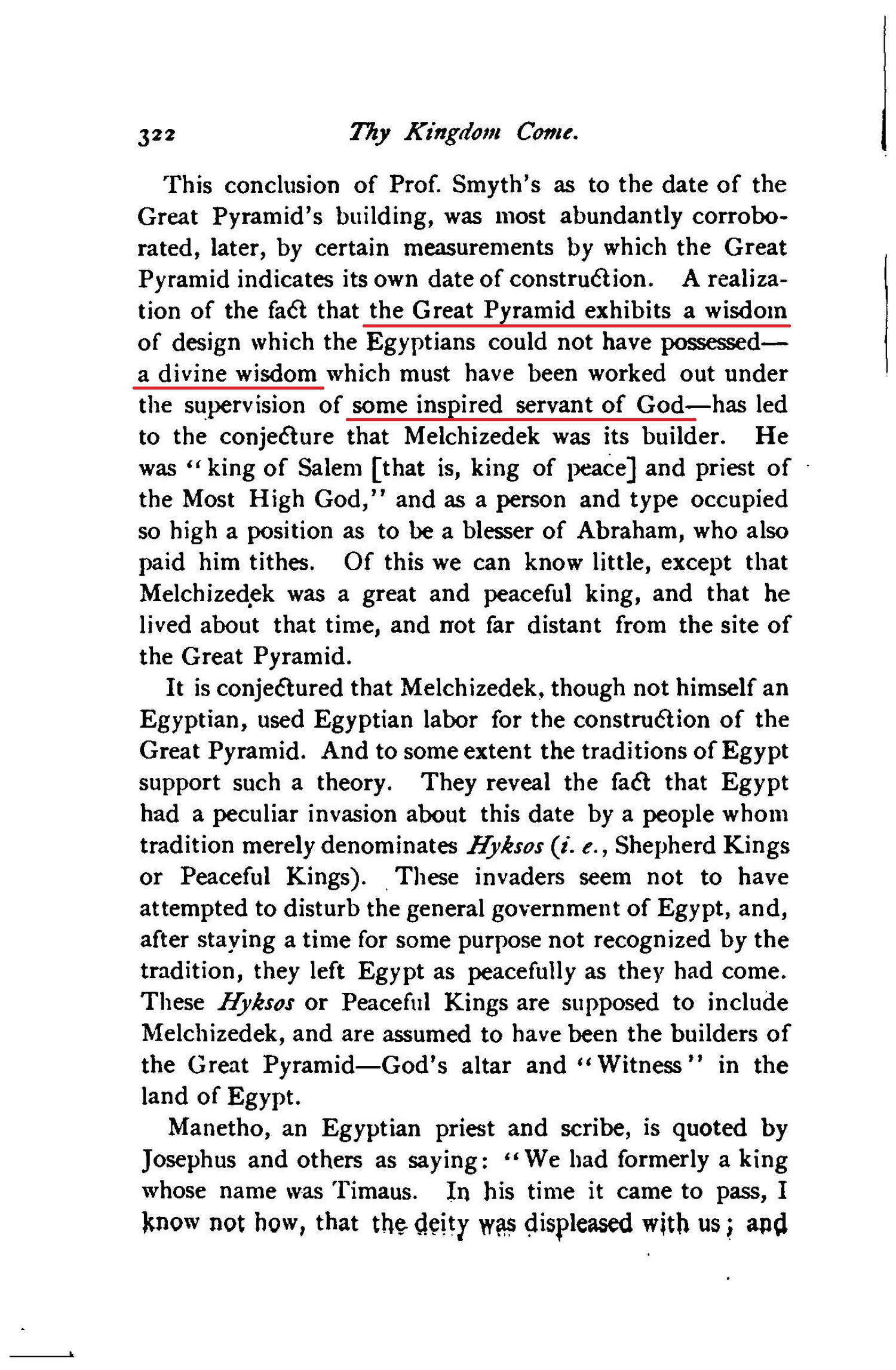 Prof. Smyth has concluded that the Great Pyramid was builded in the year 2170 B.c. [...] This conclusion of Prof. Smyth's as to the date of the Great Pyramid's building, was most abundantly corroborated, later, by certain measurements by which the Great Pyramid indicates its own date of construction. A realization of the fact that the Great Pyramid exhibits a wisdom of design which the Egyptians could not have possessed a divine wisdom which must have been worked out under the supervision of some inspired servant of God - has led to the conjecture that Melchizedek was its builder. He was "king of Salem [that is, king of peace] and priest of the Most High God," and as a person and type occupied so high a position as to be a blesser of Abraham, who also paid him tithes. Of this we can know little, except that Melchizedek was a great and peaceful king, and that he lived about that time, and not far distant from the site of the Great Pyramid.