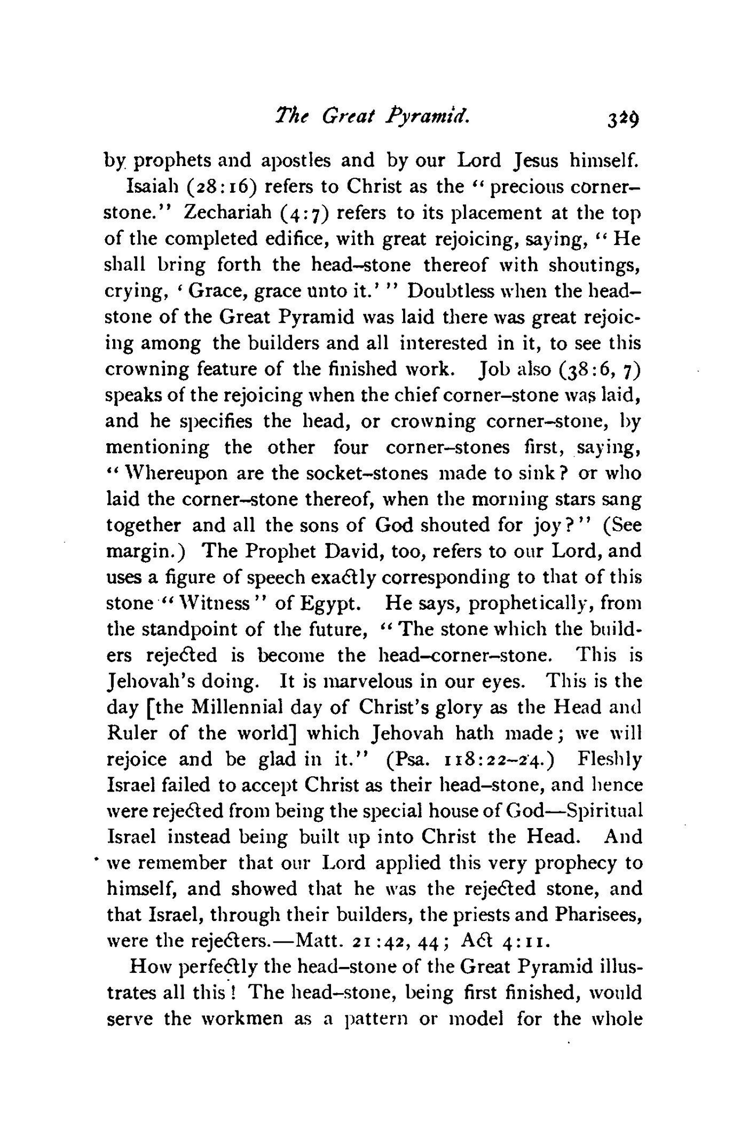 Isaiah (28:16) refers to Christ as the "precious cornerstone." [...] Doubtless when the headstone of the Great Pyramid was laid there was great rejoicing among the builders and all interested in it, to see this crowning feature of the finished work. Source : 🇺🇸 1891 (first ed.) - Thy Kingdom Come, Studies in the Scriptures, vol. III, 1891, Chapter X, page 328, page 329 - [archive.org] |