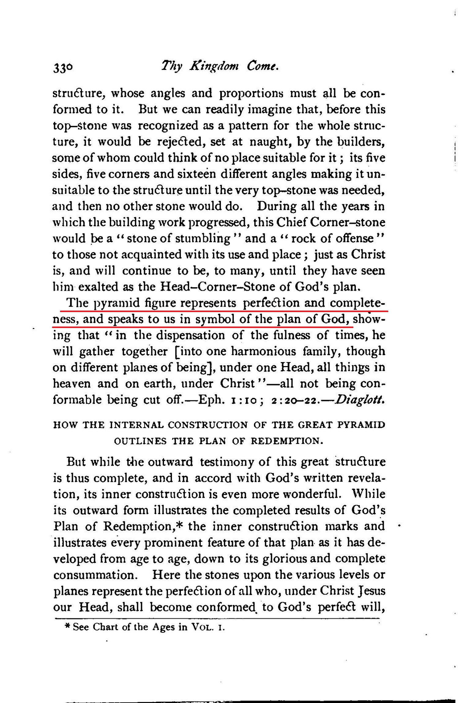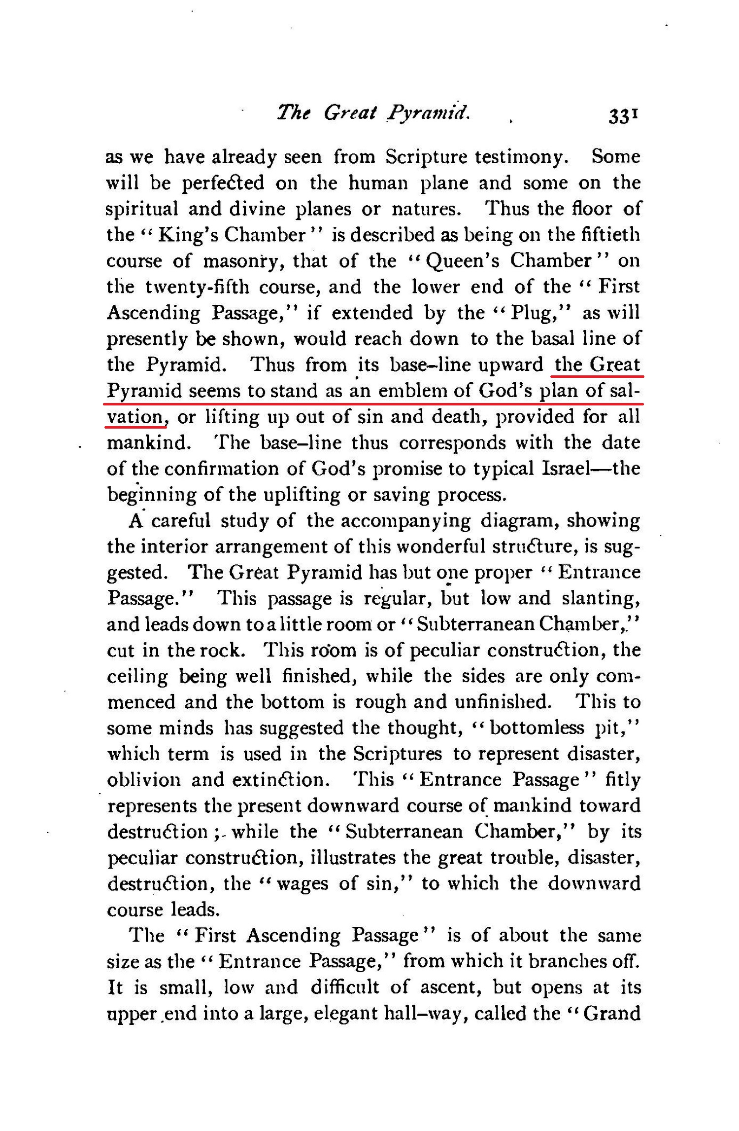 While its outward form illustrates the completed results of God's Plan of Redemption, the inner construction marks and illustrates every prominent feature of that plan as it has developed from age to age, down to its glorious and complete consummation. Here the stones upon the various levels or planes represent the perfection of all who, under Christ Jesus our Head, shall become conformed to God's perfect will, [...] Thus from its base-line upward the Great Pyramid seems to stand as an emblem of God's plan of salvation, or lifting up out of sin and death, provided for all mankind. Source : 🇺🇸 1891 (first ed.) - Thy Kingdom Come, Studies in the Scriptures, vol. III, 1891, Chapter X, page 330, page 331 - [archive.org] |