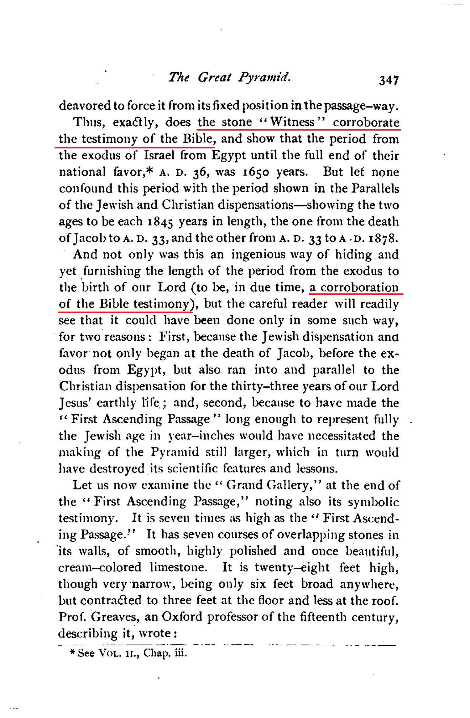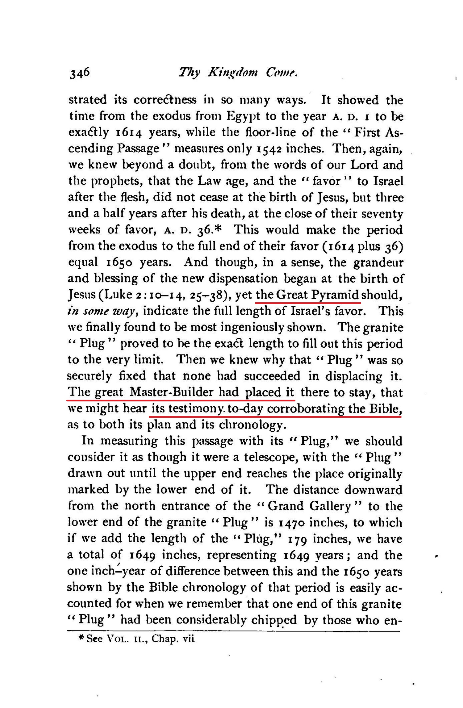 [...] yet the Great Pyramid should, in some way, indicate the full length of Israel's favor. This we finally found to be most ingeniously shown. The granite "Plug" proved to be the exact length to fill out this period to the very limit. Then we knew why that "Plug" was so securely fixed that none had succeeded in displacing it. The great Master-Builder had placed it there to stay, that me might hear its testimony. to-day corroborating the Bible, as to both its plan and its chronology. [...] Thus, exactly, does the stone "Witness" corroborate the testimony of the Bible, and show that the period from the exodus of Israel from Egypt until the full end of their national favor, A. D. 36, was 1650 years. [...] And not only was this an ingenious way of hiding and yet furnishing the length of the period from the exodus to the birth of our Lord (to be, in due time, a corroboration of the Bible testimony), but the careful reader will readily see that it could have been done only in some such may, [...]