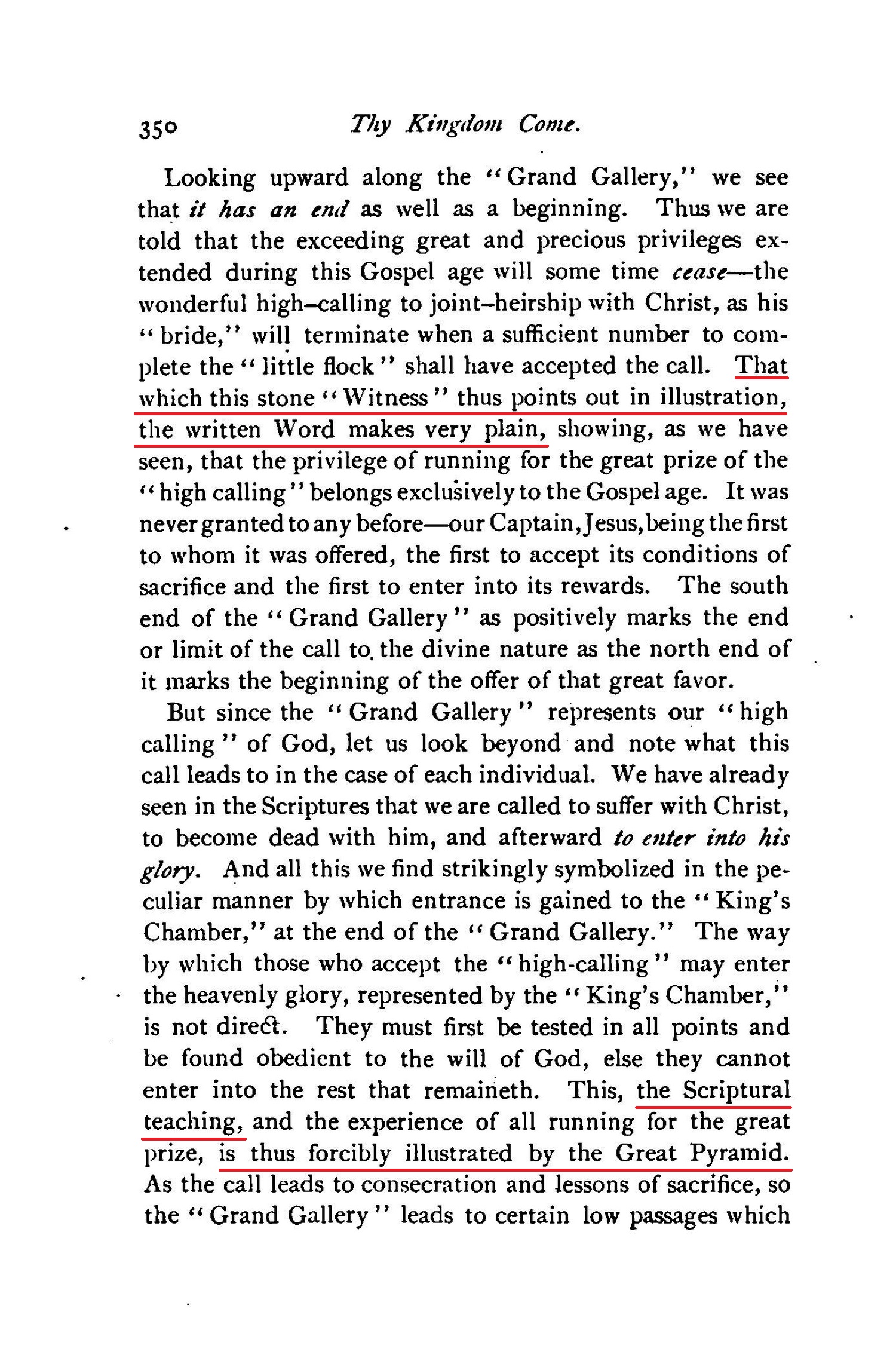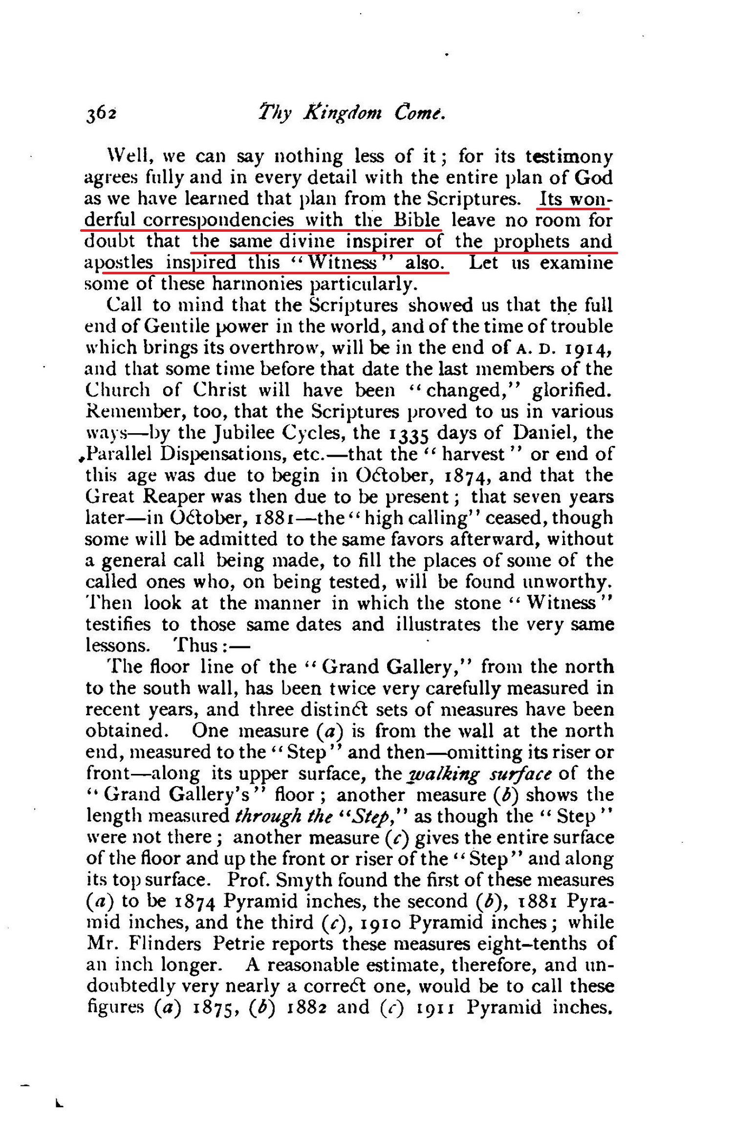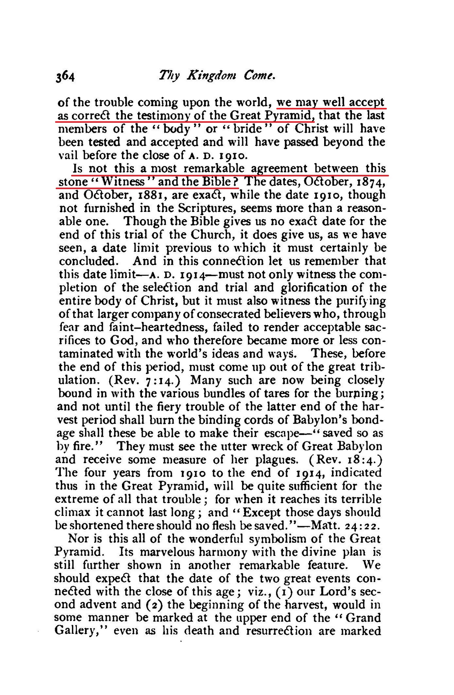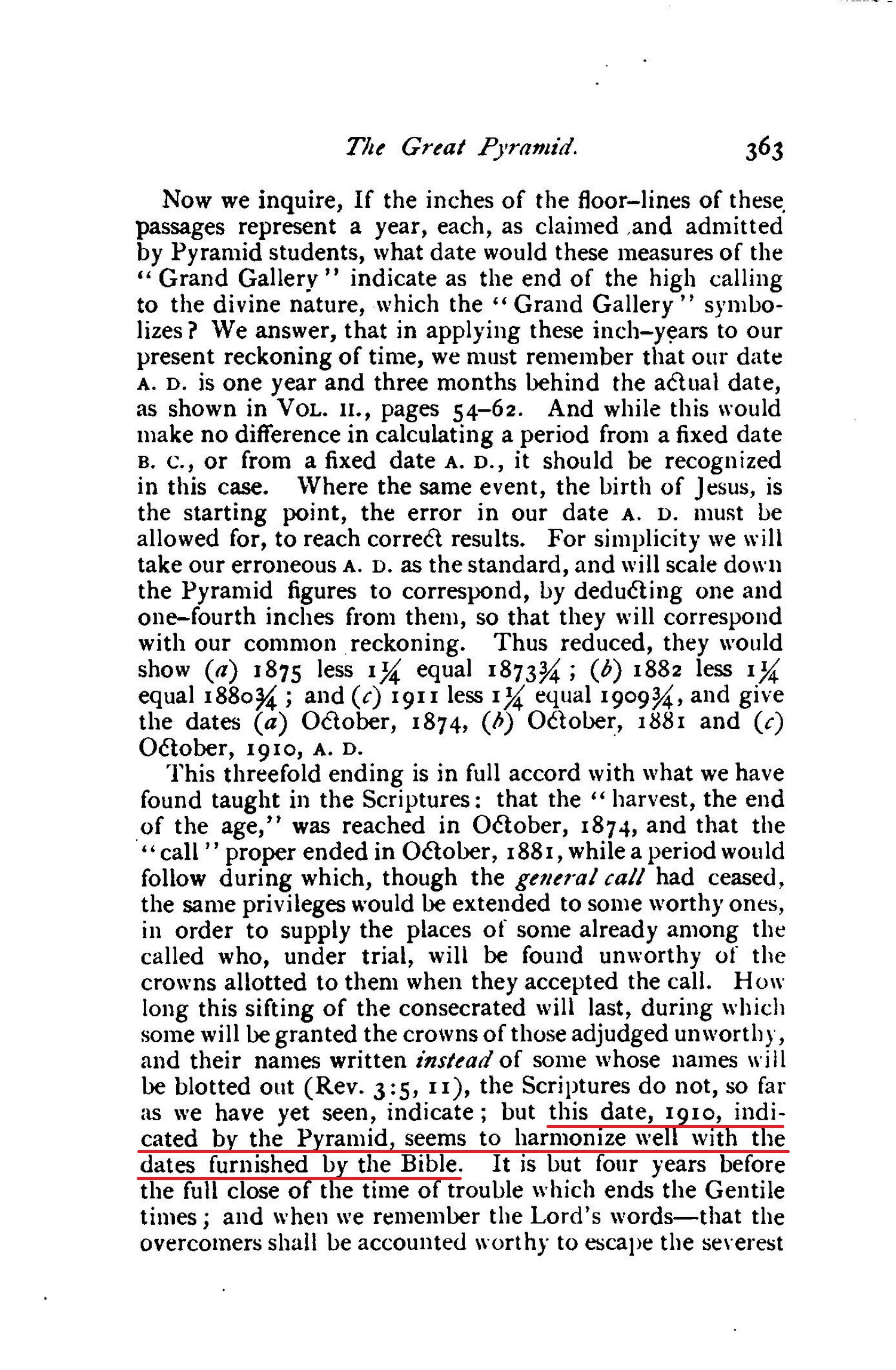 but this date, 1910, indicated by the Pyramid, seems to harmonize well with the dates furnished by the Bible. [...] we may well accept as correct the testimony of the Great Pyramid, that the last members of the "body" or "bride" of Christ will have been tested and accepted and will have passed beyond the vail before the close of A.D. 1910. [...] Is not this a most remarkable agreement between this stone "Witness" and the Bible?