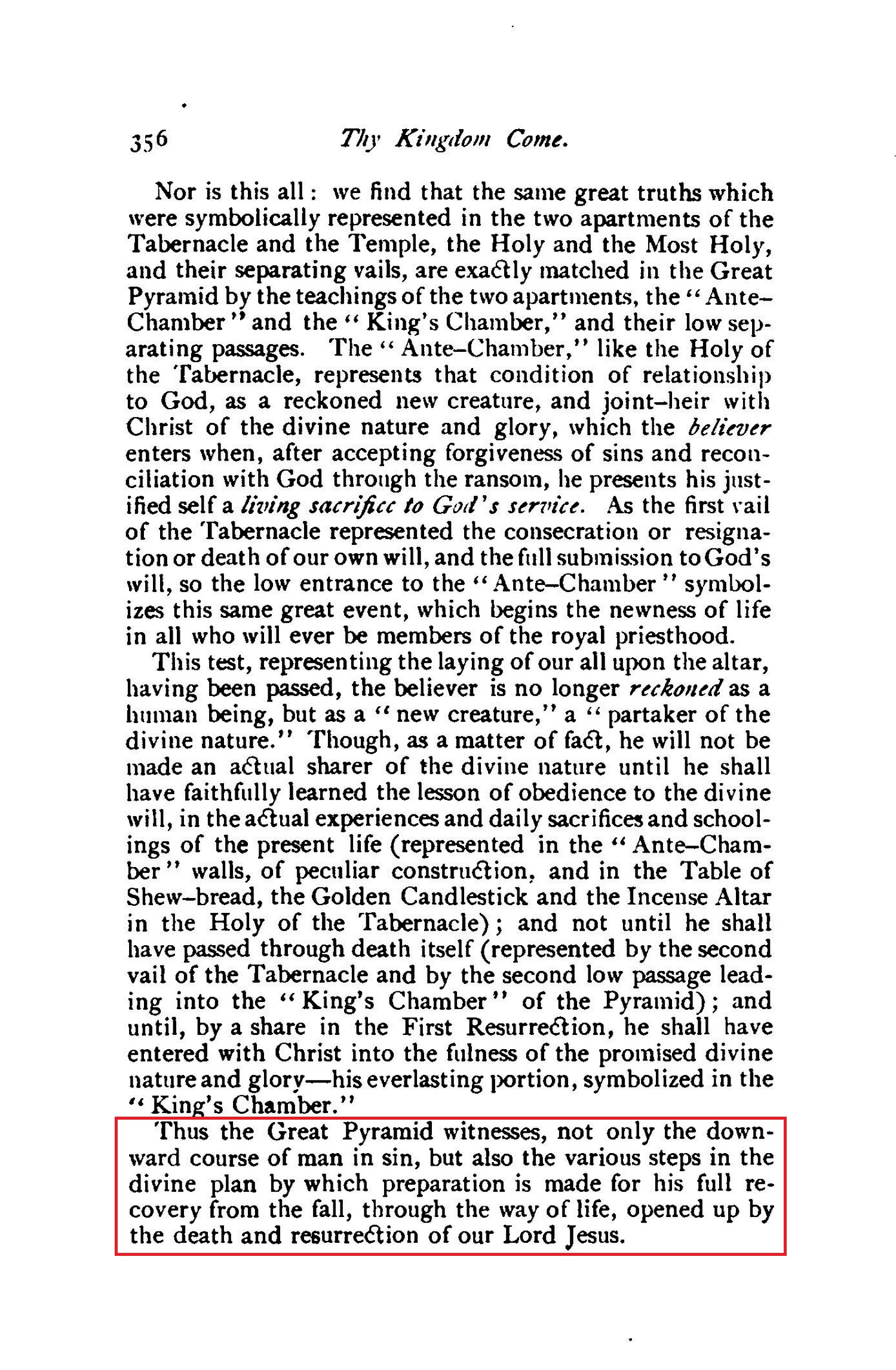 Thus the Great Pyramid witnesses, not only the downward course of man in sin, but also the various steps in the divine plan by which preparation is made for his full recovery from the fall, through the way of life, opened up by the death and resurrection of our Lord Jesus.