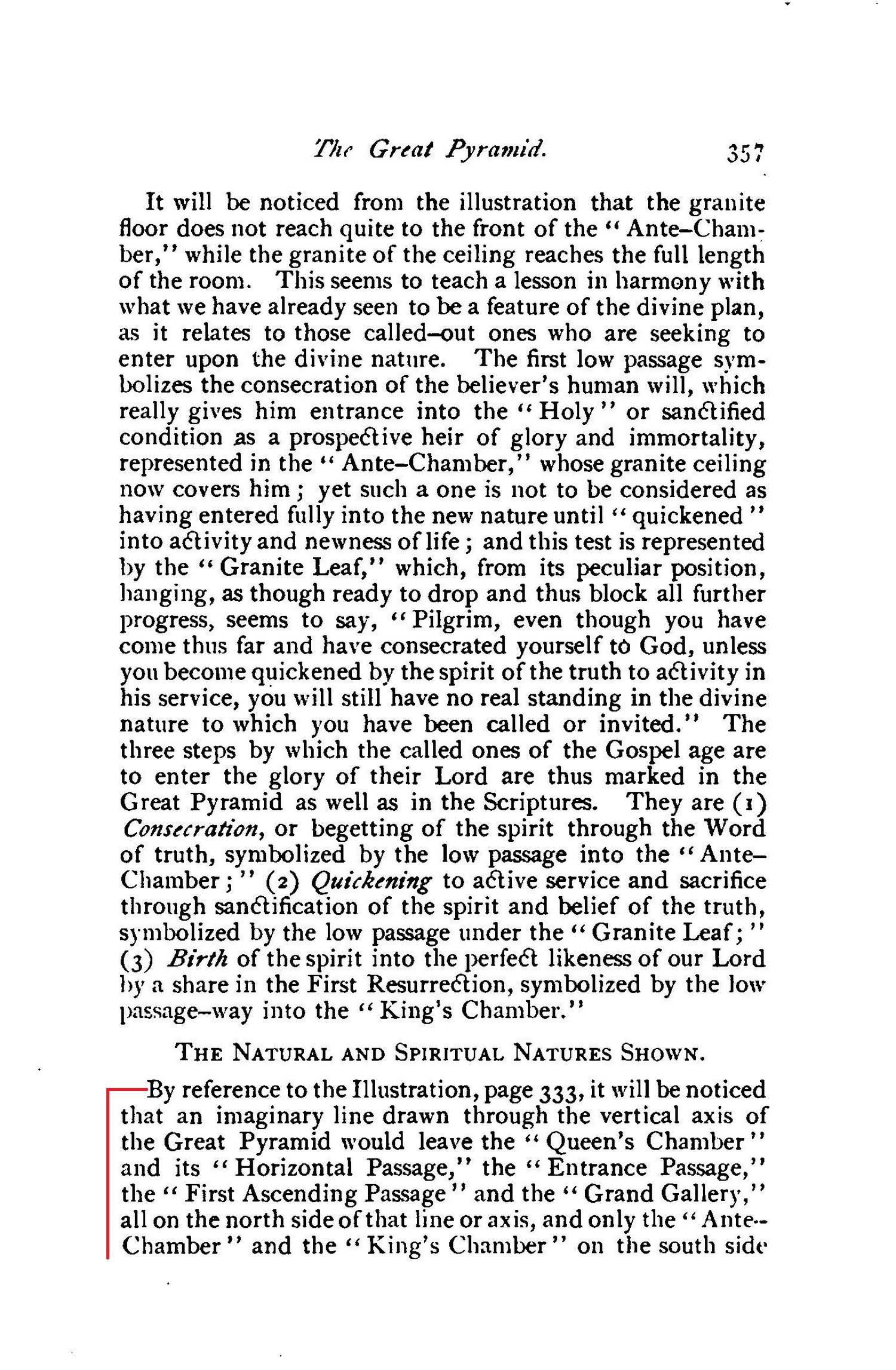 By reference to the Illustration, page 333, it will be noticed that an imaginary line drawn through the vertical axis of the Great Pyramid would leave the "Queen's Chamber" and its Horizontal Passage," the "Entrance Passage," the "First Ascending Passage" and the "Grand Gallery," all on the north side of that line or axis, and only the "AnteChamber" and the "King's Chamber" on the south side of it. By this arrangement the designer of the Great Pyramid (Jehovah) points out to us the distinction of natures, as noted in VOL. I., Chap. x.