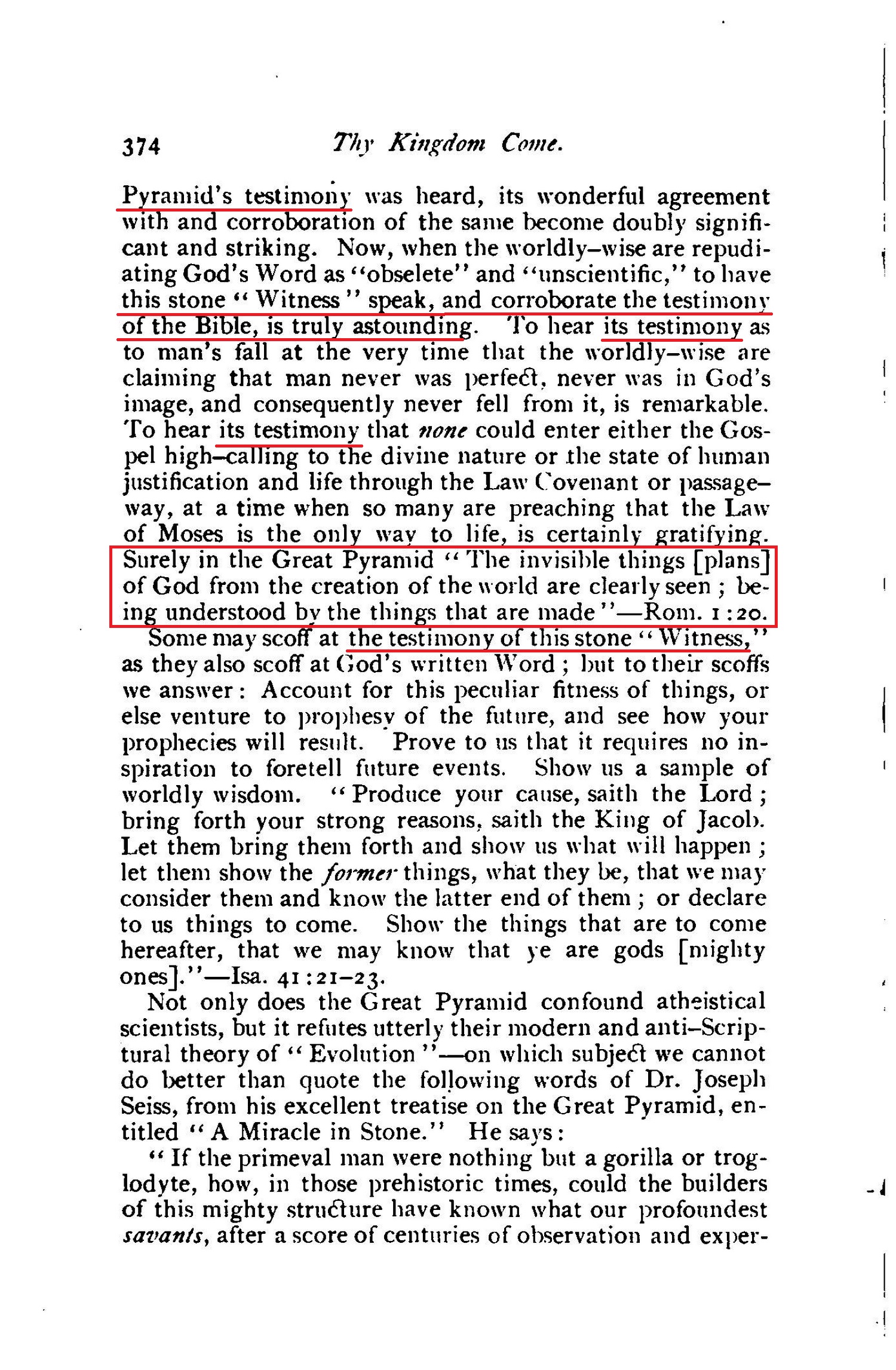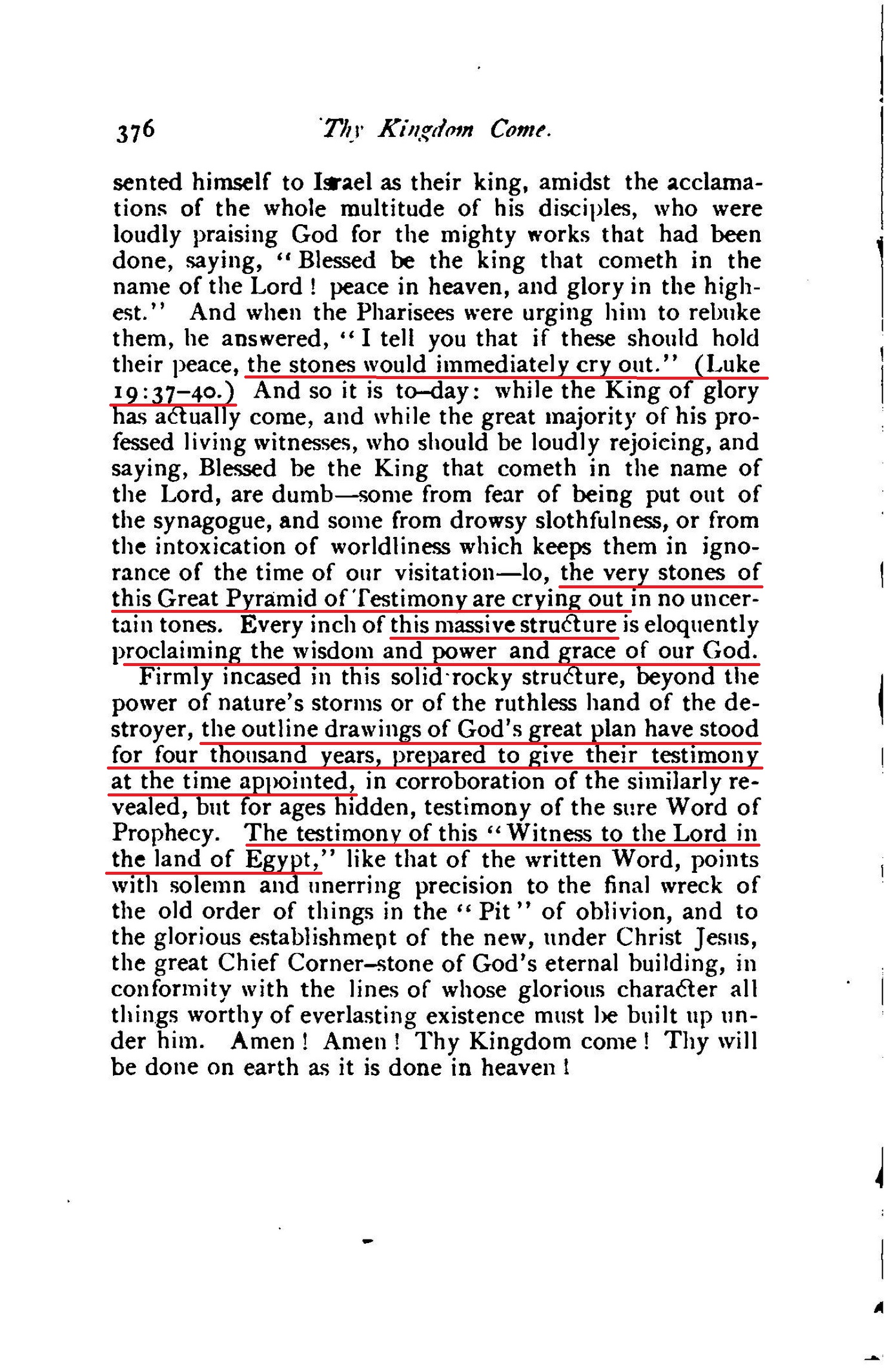 And when the Pharisees were urging him to rebuke them, he answered,"I tell you that if these should hold their peace, the stones would immediately cry out." (Luke 19:37-40.) [...] lo, the very stones of this Great Pyramid of Testimony are crying out in no uncertain tones. Every inch of this massive structure is eloquently proclaiming the wisdom and power and grace of our God.