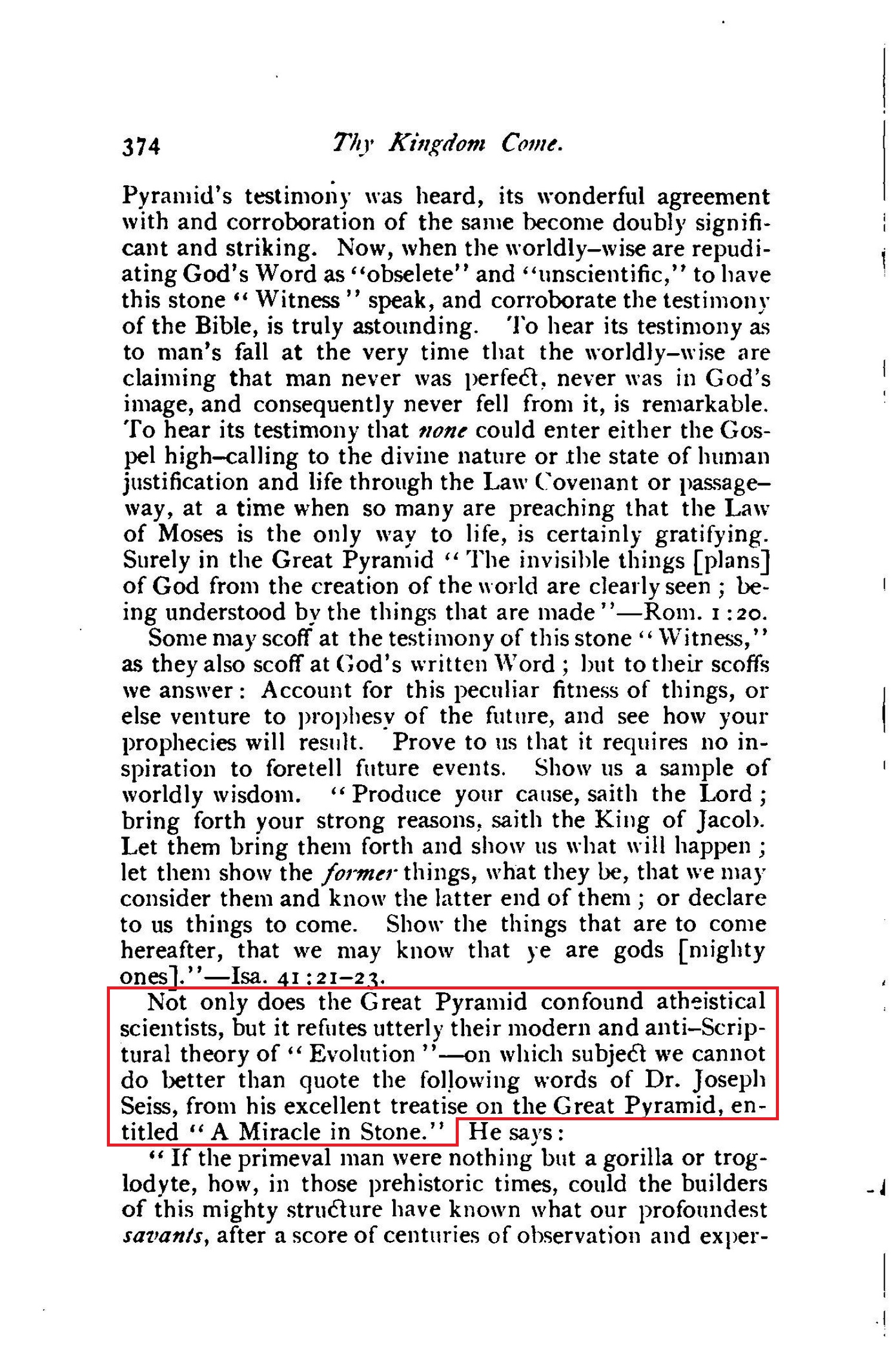 Not only does the Great Pyramid confound atheistical scientists, but it refutes utterly their modern and anti-Scriptural theory of "Evolution" - on which subjeEt we cannot do better than quote the following words of Dr. Joseph Seiss, from his excellent treatise on the Great Pyramid, entitled "A Miracle in Stone."