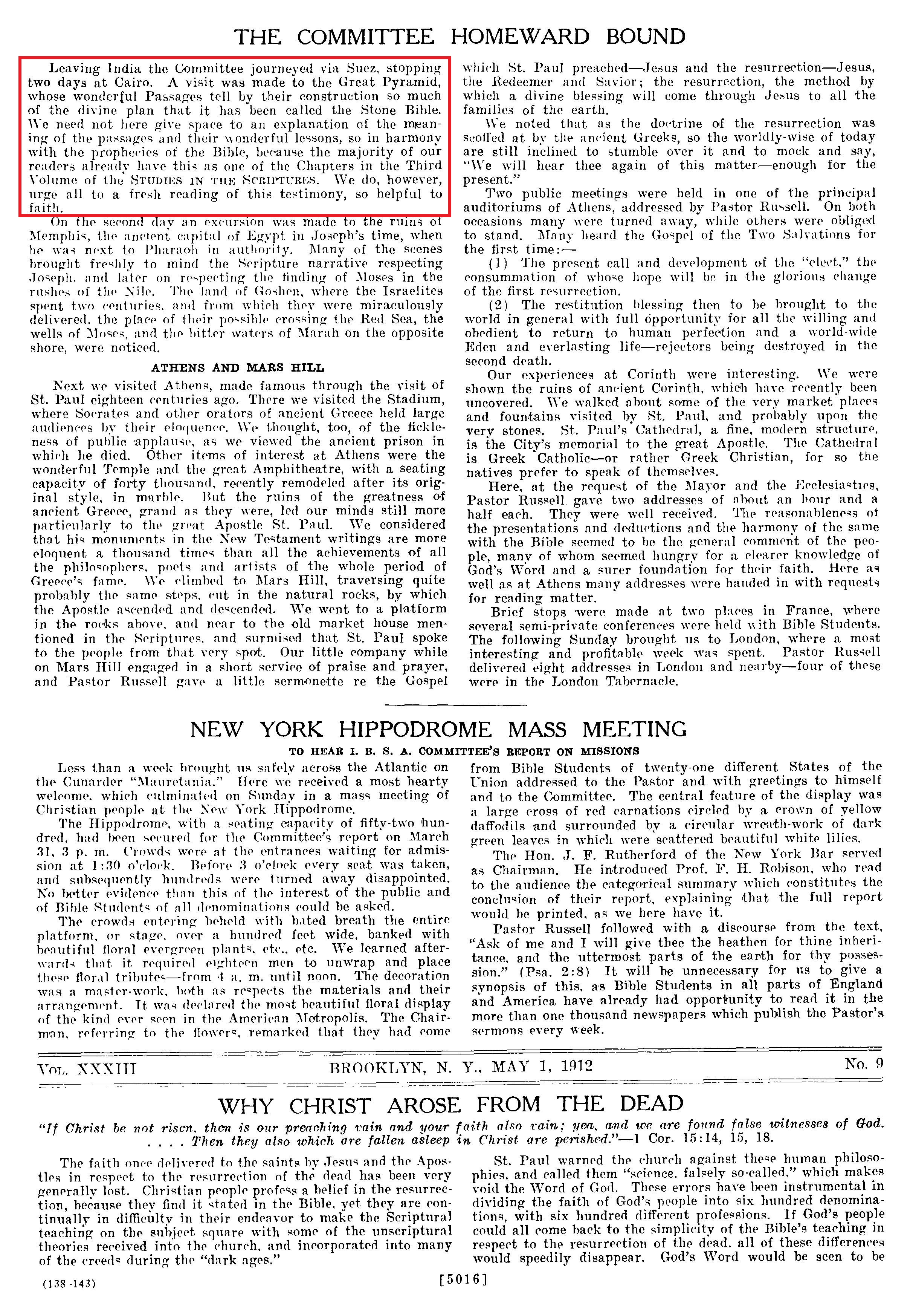 Leaving India the Gommittee journeyed via Suez, stopping two days at Cairo. A visit was made to the Great Pyramid, whose wonderful Passages tell by their construction so much of the divine plan that it has been called the Stone Bible. We need not here give space to an explanation of the meaning of the passages and their wonderful lessons, so in harmony with the prophecies of the Bible, because the majority of our readers already have this as one of the Chapters in the Third Volume of the STUDIES IN THE SCRIPTURES. We do, however, urge all to a fresh reading of this testimony, so helpful to faith.