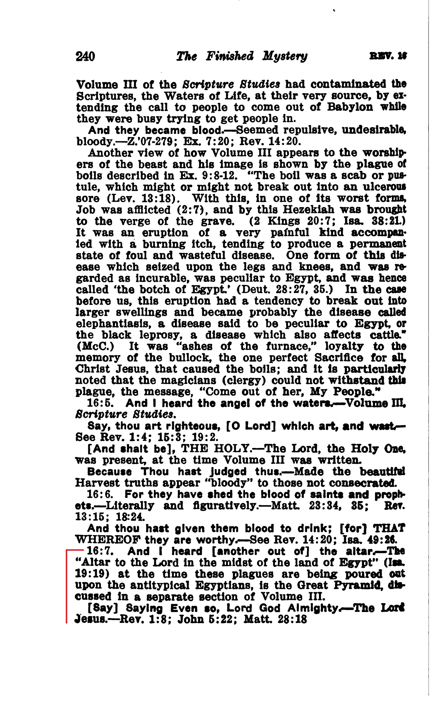 16:7. And I heard [another out of] the altar. — The "Altar to the Lord in the midst of the land of Egypt" (Isa. 19:19) at the time these plagues are being poured out upon the antitypical Egyptians, is the Great Pyramid, discussed in a separate section of Volume III.