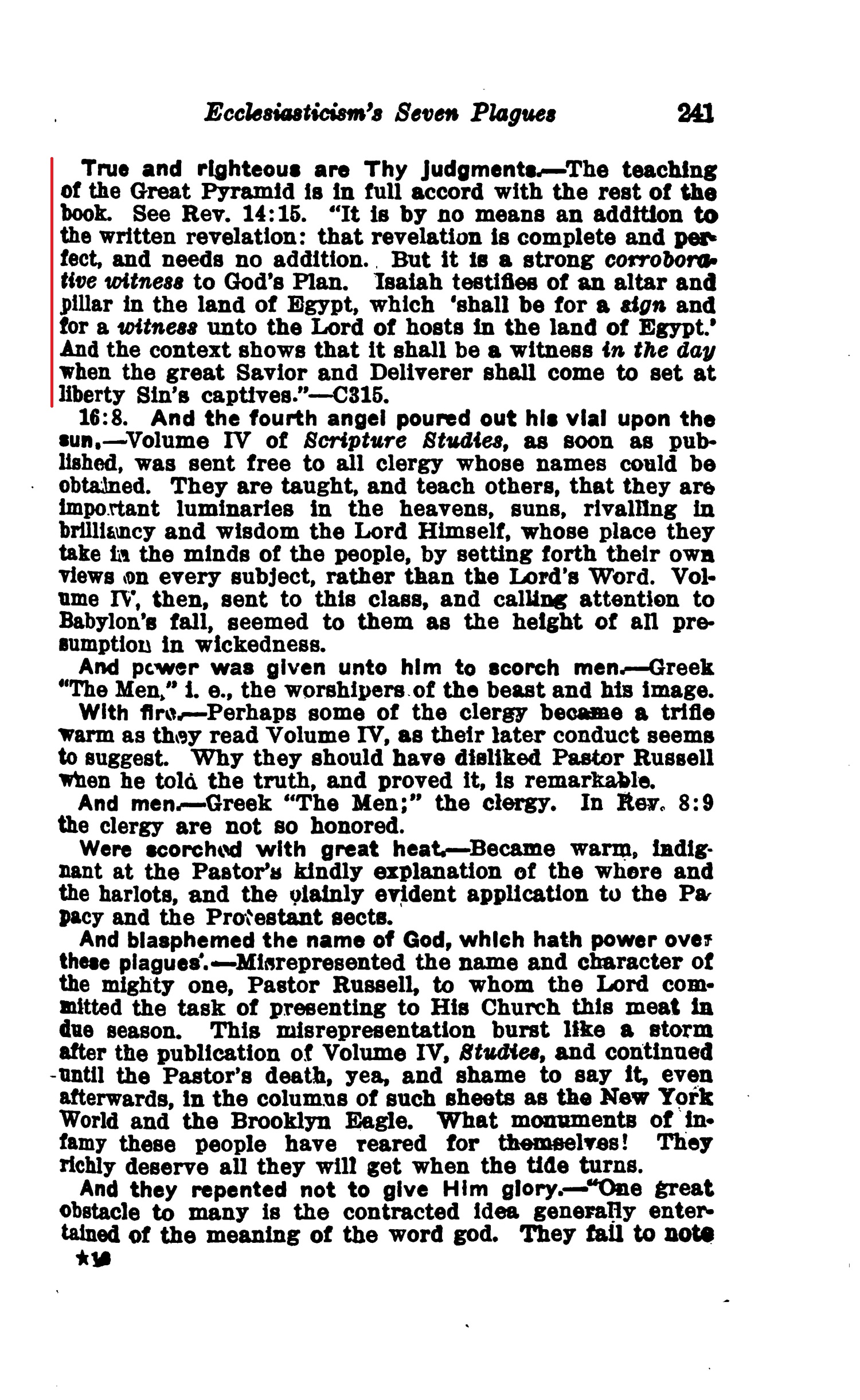 [Say] Saying Even so, Lord God Almighty, — The Lord Jesus. — Rev. 1:8; John 5:22; Matt 28:18 True and righteous are Thy Judgments — The teaching of the Great Pyramid is In full accord with the rest of the book. See Rev. 14:15. "It Is by no means an addition to the written revelation: that revelation is complete and perfect, and needs no addition. But it is a strong corroborative witness to God's Plan. Isaiah testifies of an altar and pillar In the land of Egypt, which 'shall be for a sign and for a witness unto the Lord of hosts In the land of Egypt' And the context shows that it shall be a witness in the day when the great Savior and Deliverer shall come to set at liberty Sin's captives." — C315. Source : 🇺🇸 1917 - Studies in the Scriptures, Vol 7, The finished mystery, page 240, page 241 + Cover |