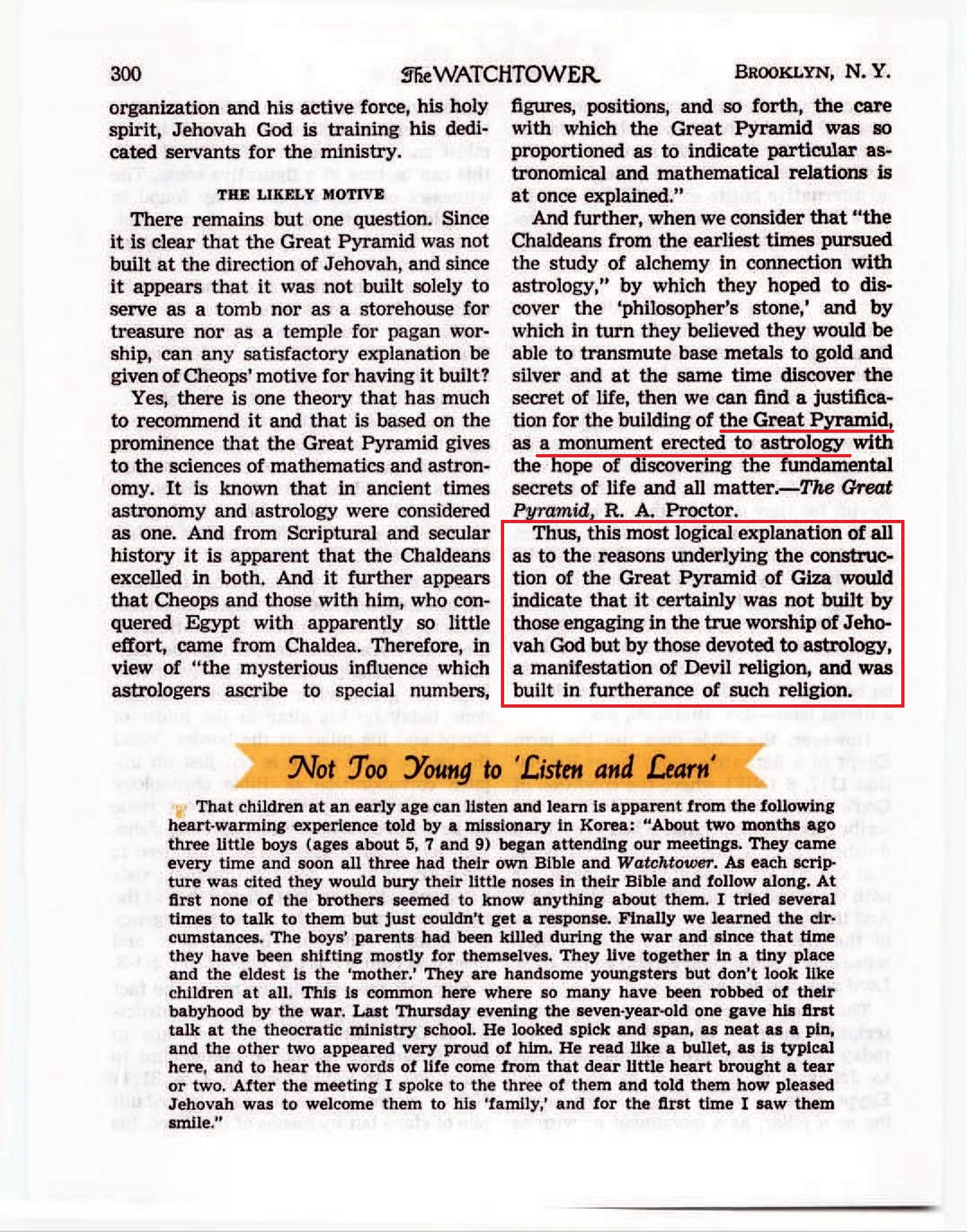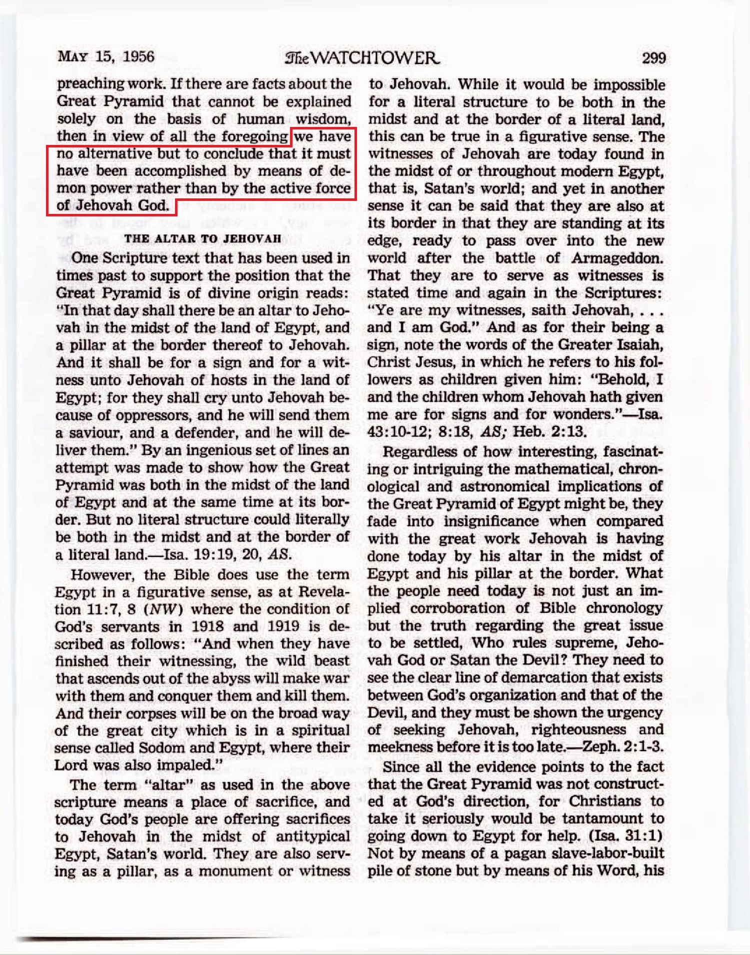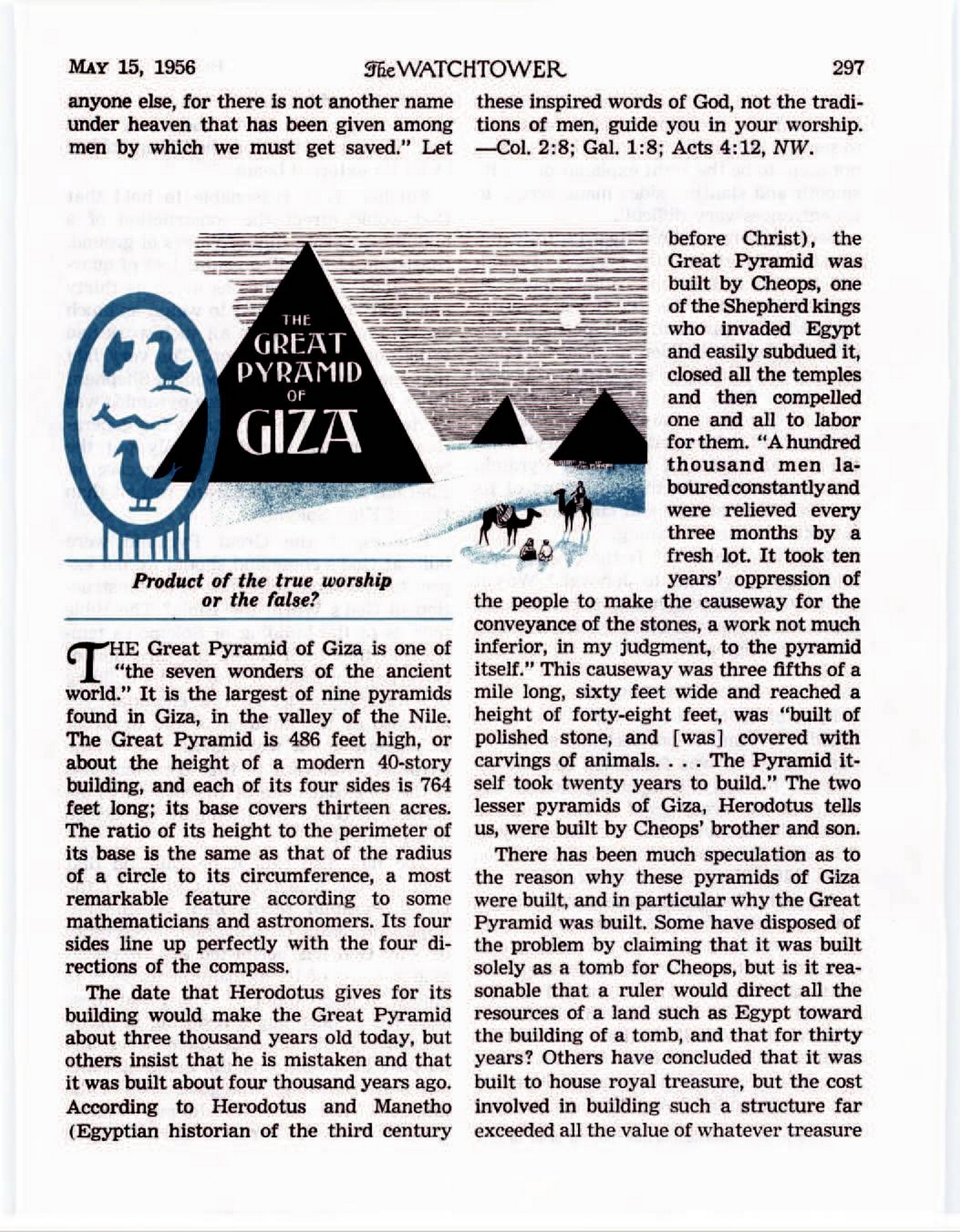 Thus, this most logical explanation of all as to the reasons underlying the construction of the Great Pyramid of Giza would indicate that it certainly was not built by those engaging in the true worship of Jehovah God but by those devoted to astrology, a manifestation of Devil religion, and was built in furtherance of such religion. Source : 🇺🇸 The Watchtower, May 15 1956, page 300 + Cover |