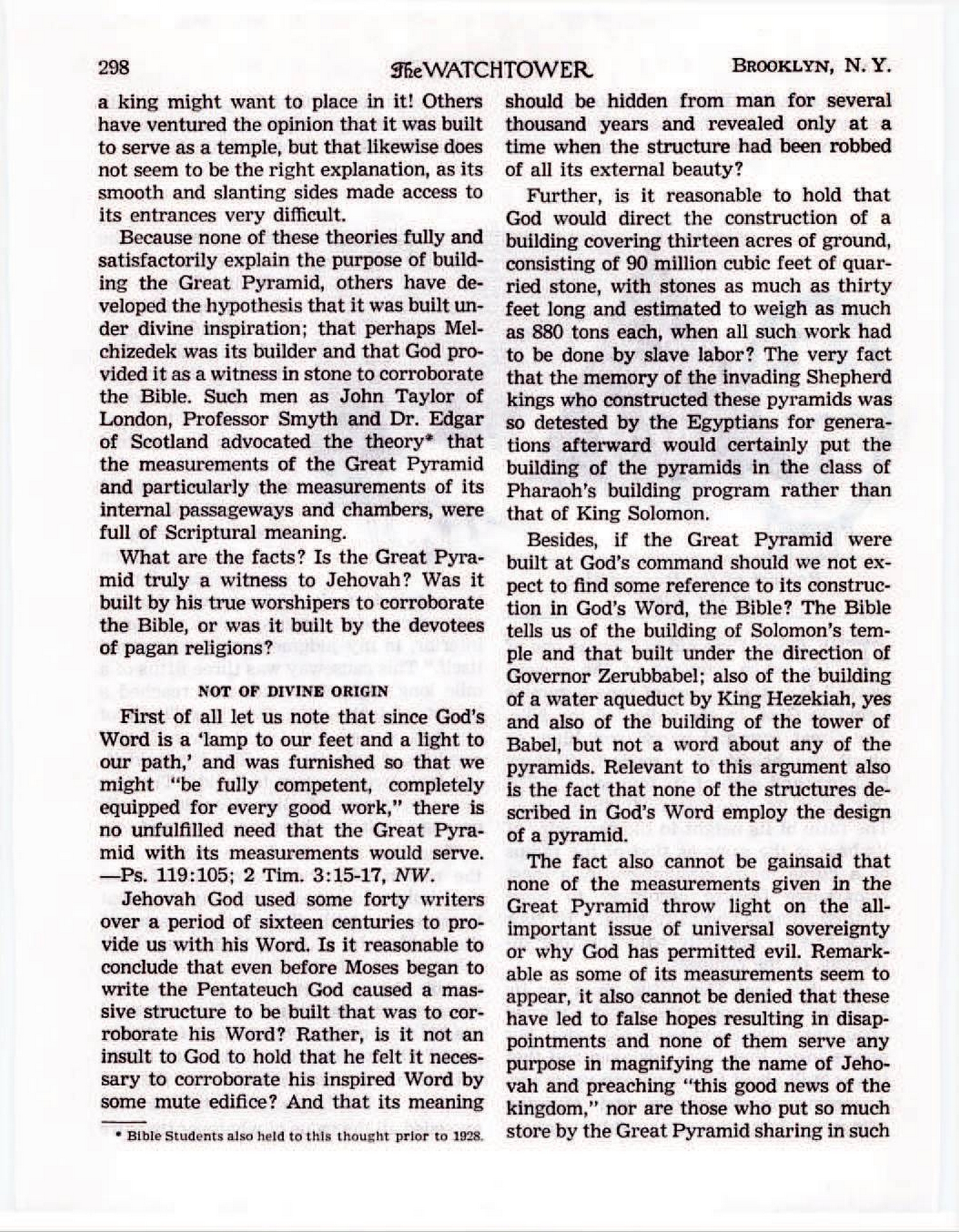 [...] Jehovah God used some forty writers over a period of sixteen centuries to provide us with his Word. Is it reasonable to conclude that even before Moses began to write the Pentateuch God caused a massive structure to be built that was to corroborate his Word? Rather, is it not an insult to God to hold that he felt it necessary to corroborate his inspired Word by some mute edifice? And that its meaning should be hidden from man for several thousand years and revealed only at a time when the structure had been robbed of all its external beauty? Further, is it reasonable to hold that God would direct the construction of a building covering thirteen acres of ground, consisting of 90 million cubic feet of quarried stone, with stones as much as thirty feet long and estimated to weigh as much as 880 tons each, when all such work had to be done by slave labor? The very fact that the memory of the invading Shepherd kings who constructed these pyramids was so detested by the Egyptians for generations afterward would certainly put the building of the pyramids in the class of Pharaoh's building program rather than that of King Solomon. Besides, if the Great Pyramid were built at God's command should we not expect to find some reference to its construction in God's Word, the Bible? The Bible tells us of the building of Solomon's temple and that built under the direction of Governor Zerubbabel; also of the building of a water aqueduct by King Hezekiah, yes and also of the building of the tower of Babel, but not a word about any of the pyramids. Relevant to this argument also is the fact that none of the structures described in God's Word employ the design of a pyramid. The fact also cannot be gainsaid that none of the measurements given in the Great Pyramid throw light on the all-important issue of universal sovereignty or why God has permitted evil. Remarkable as some of its measurements seem to appear, it also cannot be denied that these have led to false hopes resulting in disappointments and none of them serve any purpose in magnifying the name of Jehovah and preaching "this good news of the kingdom," nor are those who put so much store by the Great Pyramid sharing in such preaching work. If there are facts about the Great Pyramid that cannot be explained solely on the basis of human wisdom, then in view of all the foregoing we have no alternative but to conclude that it must have been accomplished by means of demon power rather than by the active force of Jehovah God. Source : 🇺🇸 The Watchtower, May 15 1956, page 297, page 298, page 299 + Cover |