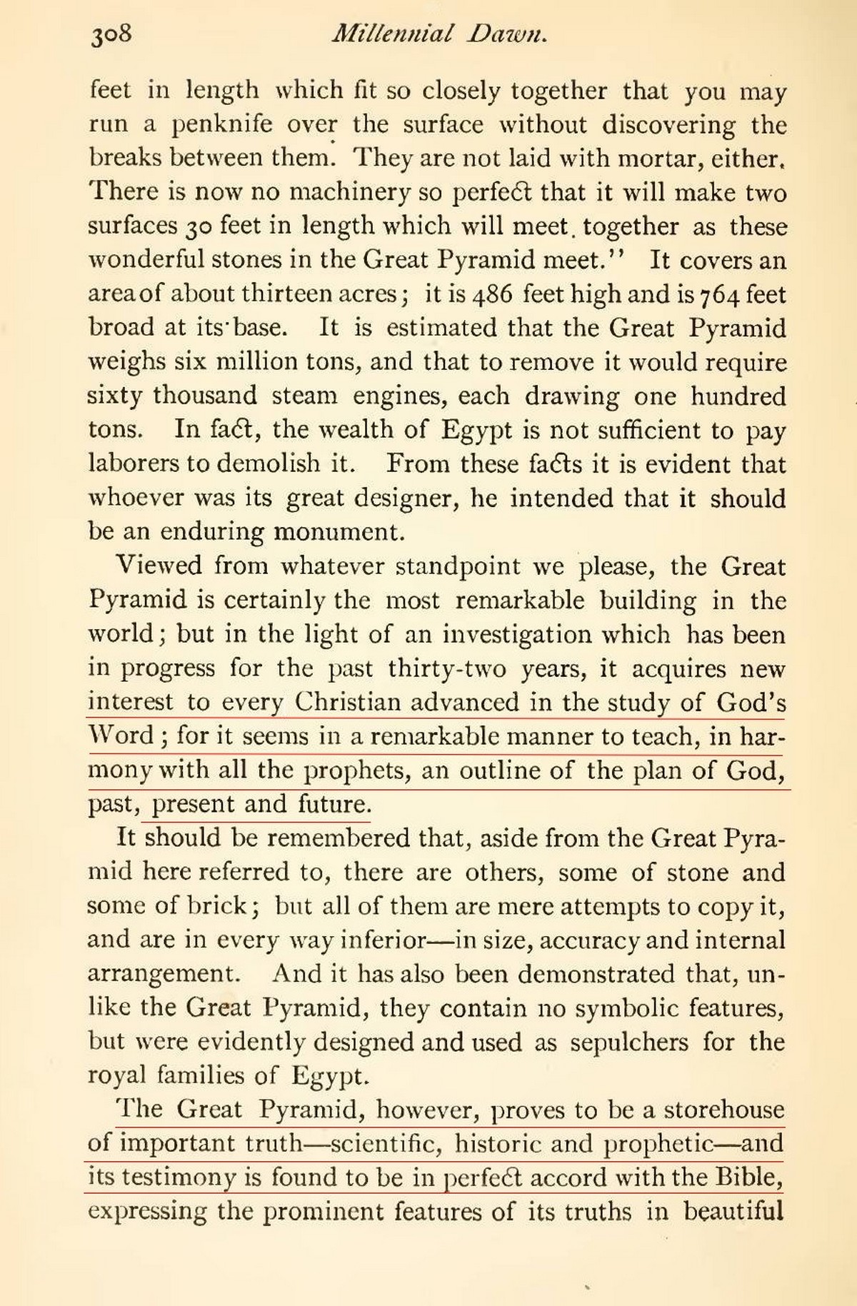 And now, having heard it speak, what shall we think of the stone "Witness" and its testimony? Such testimony would be peculiar and striking indeed, even if there were no Scriptures found to bear on the subject examined ; but when the Scriptures had already clearly and positively declared to us these same circumstances and dates, before the Pyramid testimony was heard, its wonderful agreement with and corroboration of the same become doubly significant and striking. Now, when the worldly-wise are repudiating God's Word as "obselete" and "unscientific," to have this stone "Witness" speak, and corroborate the testimony of the Bible, is truly astounding. To hear its testimony as to man's fall at the very time that the worldly-wise are claiming that man never was perfect, never was in God's image, and consequently never fell from it, is remarkable. To hear its testimony that none could enter either the Gospel high-calling to the divine nature or the state of human justification and life through the Law Covenant or passageway, at a time when so many are preaching that the Law of Moses is the only way to life, is certainly gratifying. Surely in the Great Pyramid "The invisible things [plans] of God from the creation of the norld are clearly seen ; being understood by the things that are made" - Rom. 1:20. Some way scoff at the testimony of this stone "witness," as they also scoff at God's written Word ; but to their scoffs we answer : Account for this peculiar fitness of things, or else venture to prophesy of the future, and see how your prohecies will result. Source : 🇺🇸 1891 (first ed.) - Thy Kingdom Come, Studies in the Scriptures, vol. III, 1891, Chapter X, page 373, page 374 - [archive.org] |