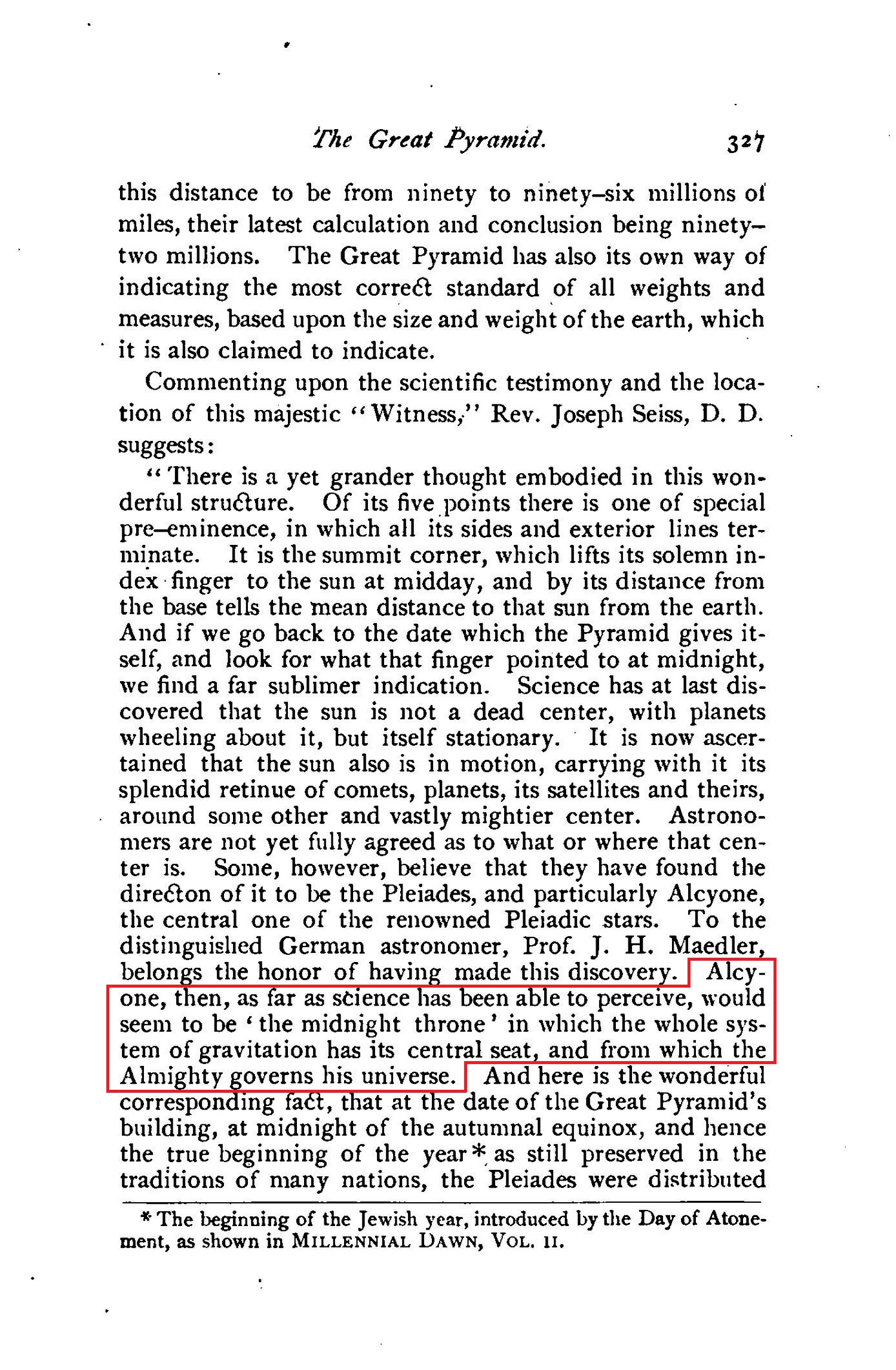 And if we go back to the date which the Pyramid gives itself, and look for what that finger pointed to at midnight, we find a far sublimer indication. Science has at last discovered that the sun is not a dead center, with planets wheeling about it, but itself stationary. It is now ascertained that the sun also is in motion, carrying with it its splendid retinue of comets, planets, its satellites and theirs, around some other and vastly mightier center. Astronomers are not yet fully agreed as to what or where that center is. Some, however, believe that they have found the directon of it to be the Pleiades, and particularly Alcyone, the central one of the renowned Pleiadic stars. To the distinguished German astrononer, Prof. J. H. Maedler, belongs the honor of having made this discovery. Alcyone, then, as far as science has been able to perceive, would seenm to be 'the midnight throne' in which the whole system of gravitation has its central seat, and from which the Almighty governs his universe.
