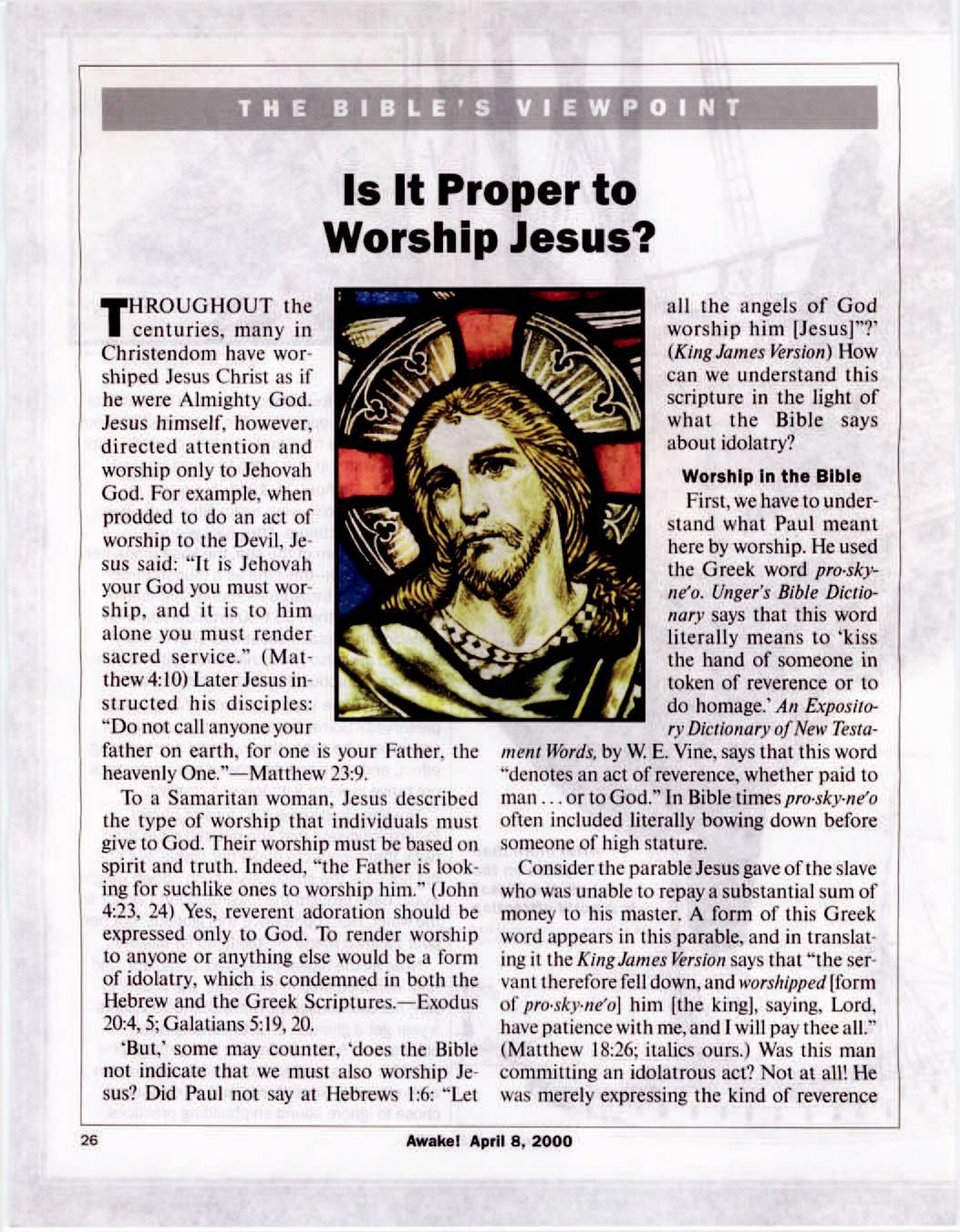The argument used in this page does not resist the original Greek. The "Awake!" magazine told that God is worshiped in Matthew 4:10 (page 26 on the left), while Jesus to whom the Greek word proskuneo is attributed receives only what would be equivalent to ‘kiss the hand of someone in token of reverence or to do homage.’ (page 26 to the right). However if one takes the time to verify the word worship attributed to God in Matthew 4:10, we will find that it is exactly the same Greek word proskuneo attributed to Jesus.