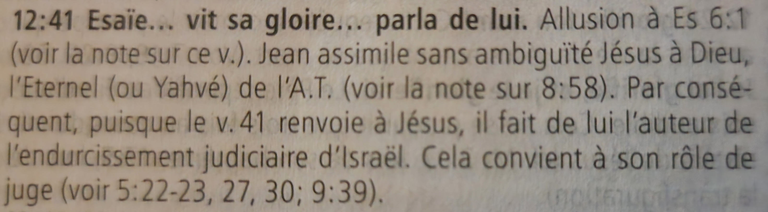 En parlant de Jésus, Jean cite Ésaïe (verset 41). Or, le verset 40 fait directement référence à Ésaïe 6:10.