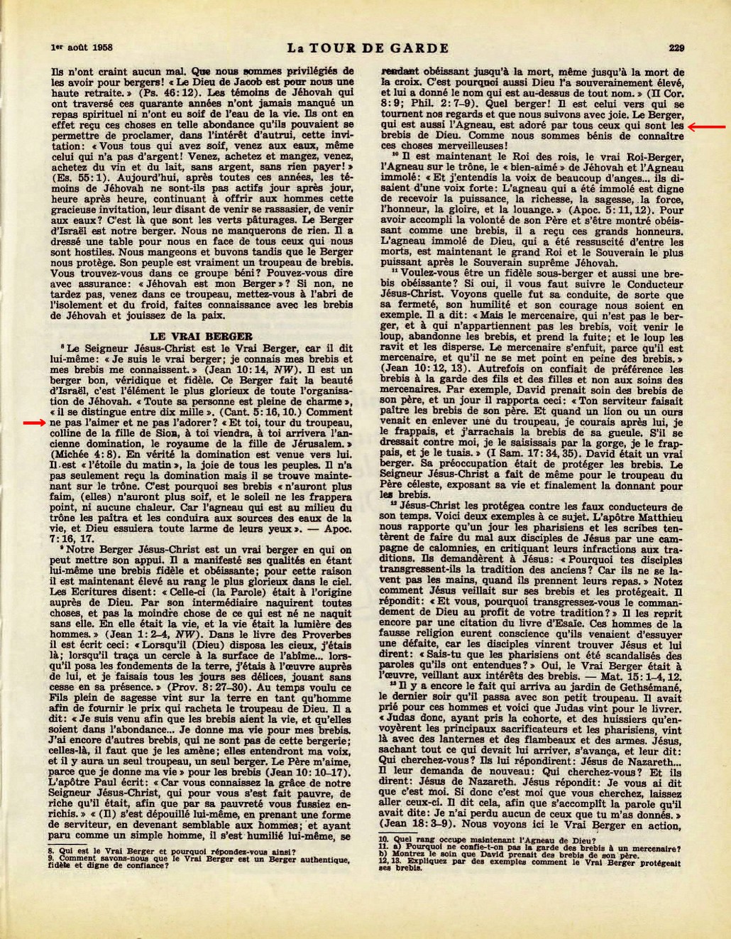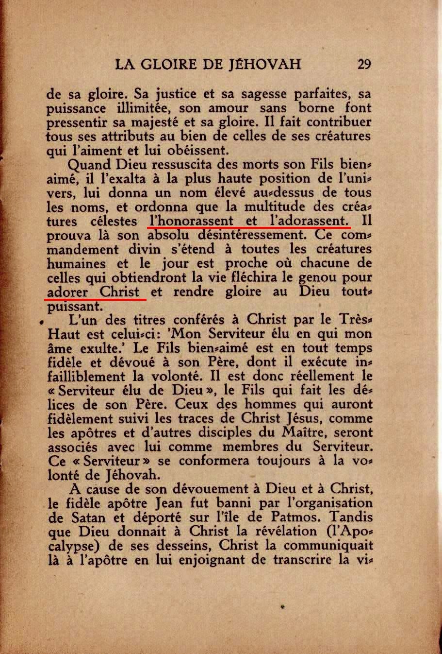 « Jéhovah rend [Jésus] infiniment plus élevé que les anges divins ou les messagers et ordonne en conséquence de l'adorer . (...) Puisque Jéhovah Dieu règne désormais en tant que roi au moyen de Sion, son organisation, quiconque voudrait l’adorer doit également adorer le chef de l’organisation de Jéhovah, à savoir Jésus-Christ, et se prosterner devant le corégent sur le trône de la théocratie. ».