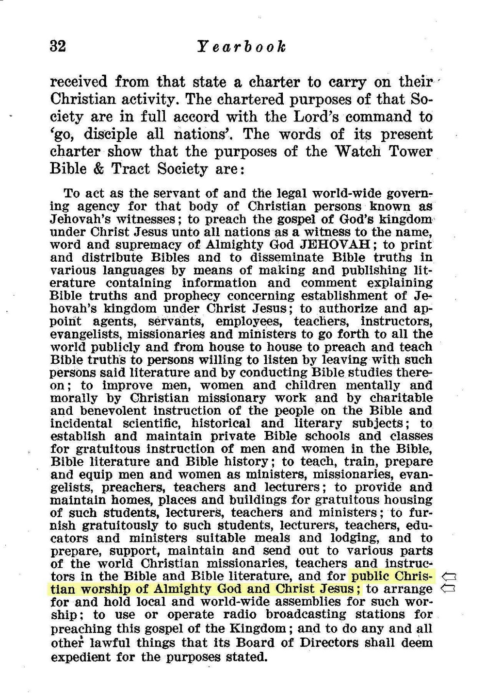 « ... the purposes of the Watch Tower Bible & Tract Society are : To act as the servant of and the legal world-wide governing agency for that body of Christian persons known as Jehovah's witnesses;..., and for public Christian worship of Almighty God and Christ Jesus; to arrange for and hold local and world-wide assemblies for such worship;... »