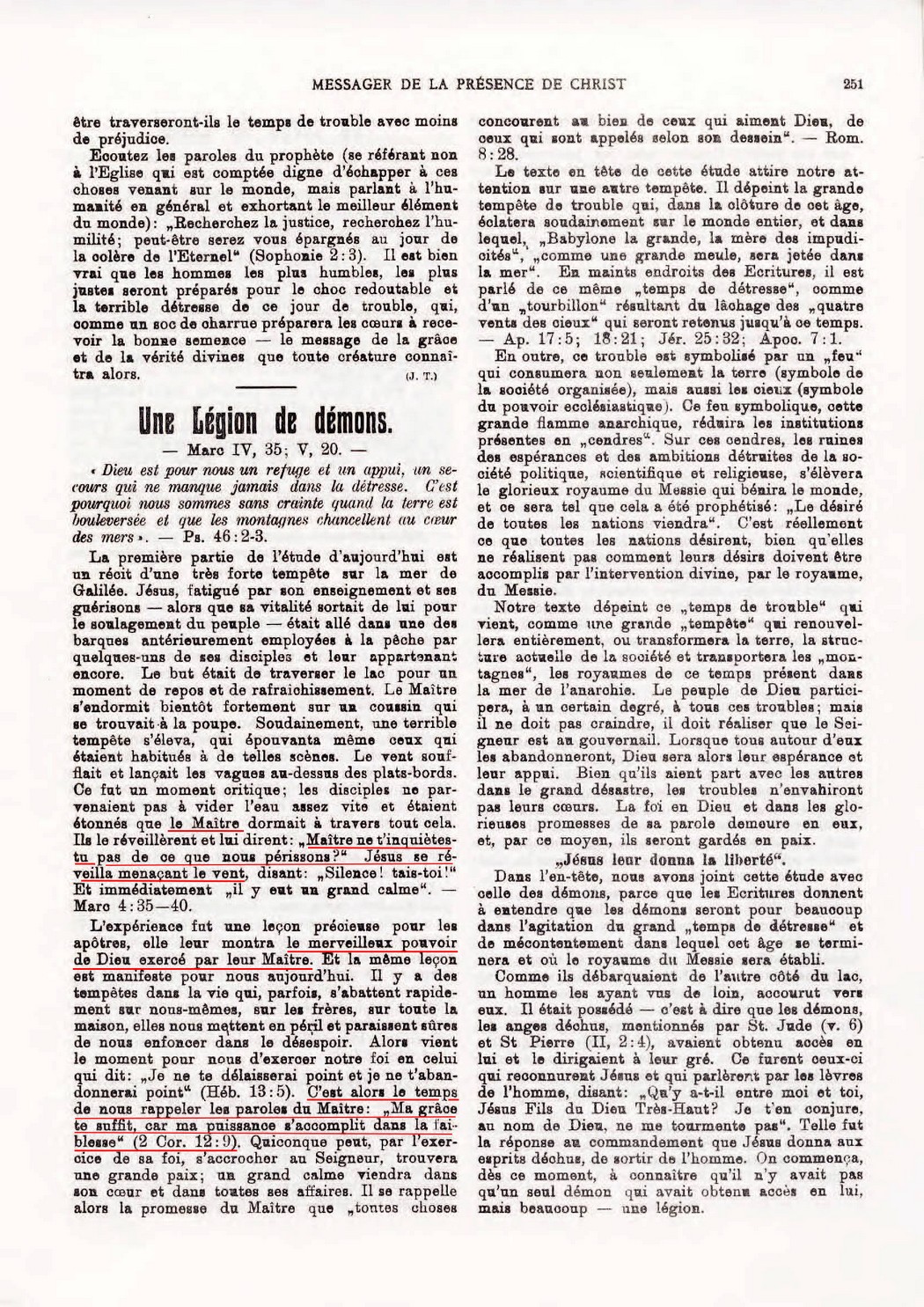 «Trois fois, j’ai prié le Seigneur (il ne dit pas : Jéhovah-Dieu) de l’éloigner de moi et Il m’a dit ‘ma grâce te suffit car ma PUISSANCE s’accomplit dans la faiblesse’. Je me glorifierai bien plus volontiers de mes faiblesses afin que la PUISSANCE de Christ repose sur moi ».