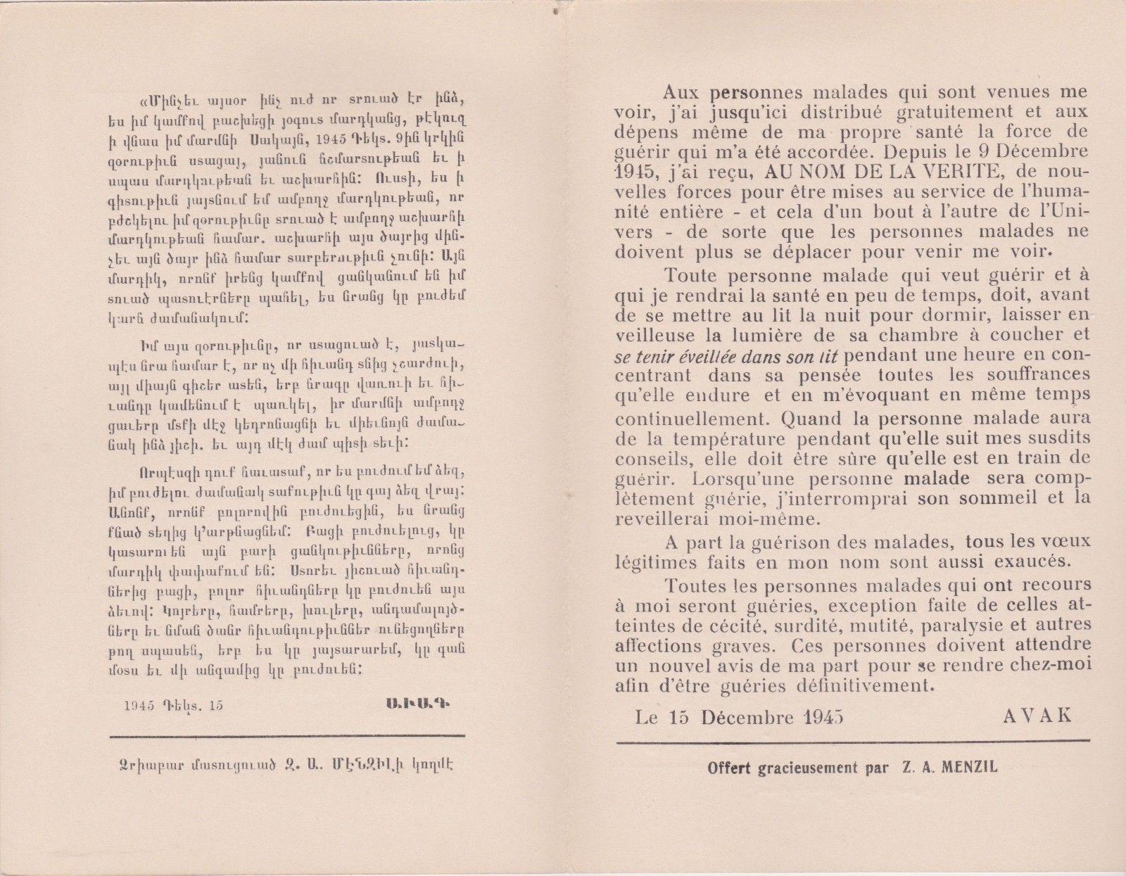Voici un texte d’Avak (daté du 15 décembre 1945) qui tranche radicalement avec la piété chrétienne :
