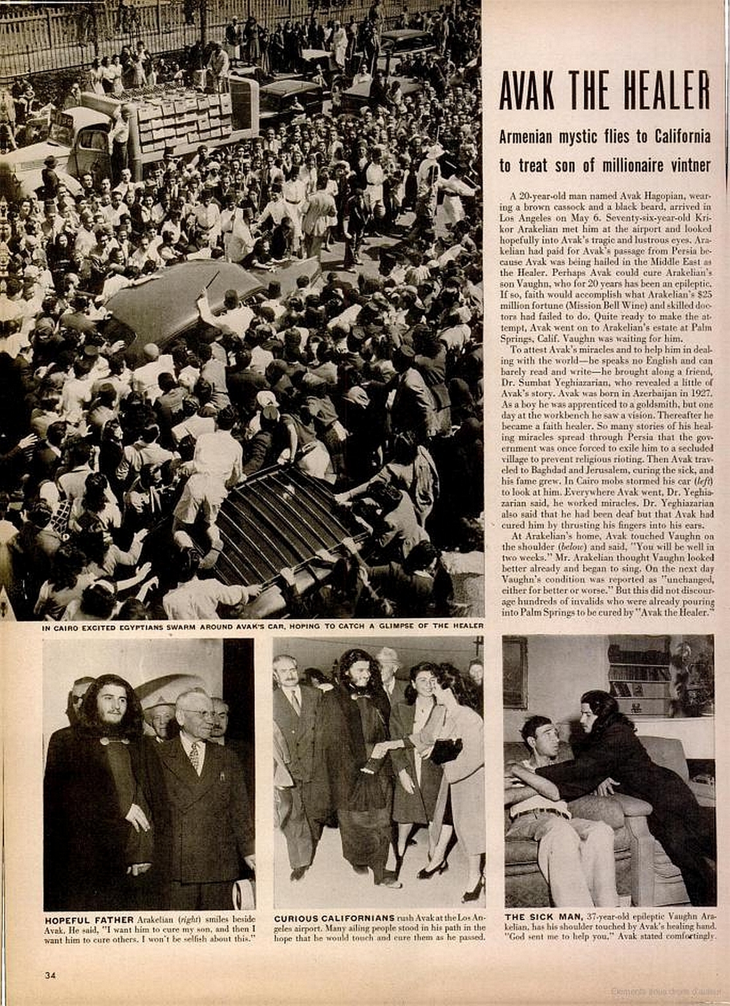 En mai 1947, Avak Hagopian est filmé à son arrivée à Los Angeles. Les images et la presse d’époque contribuent à façonner une aura “mystique” autour de lui.
