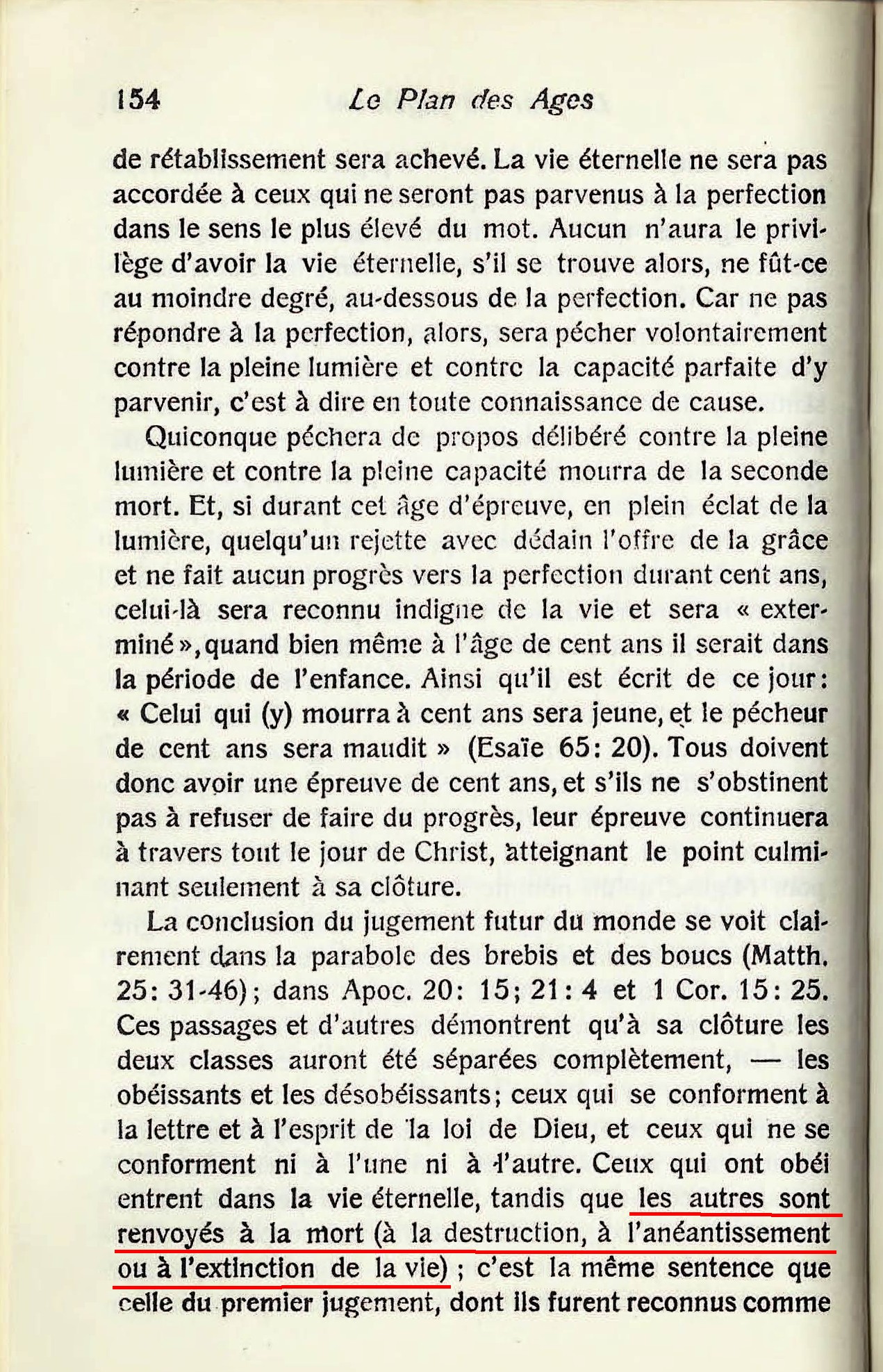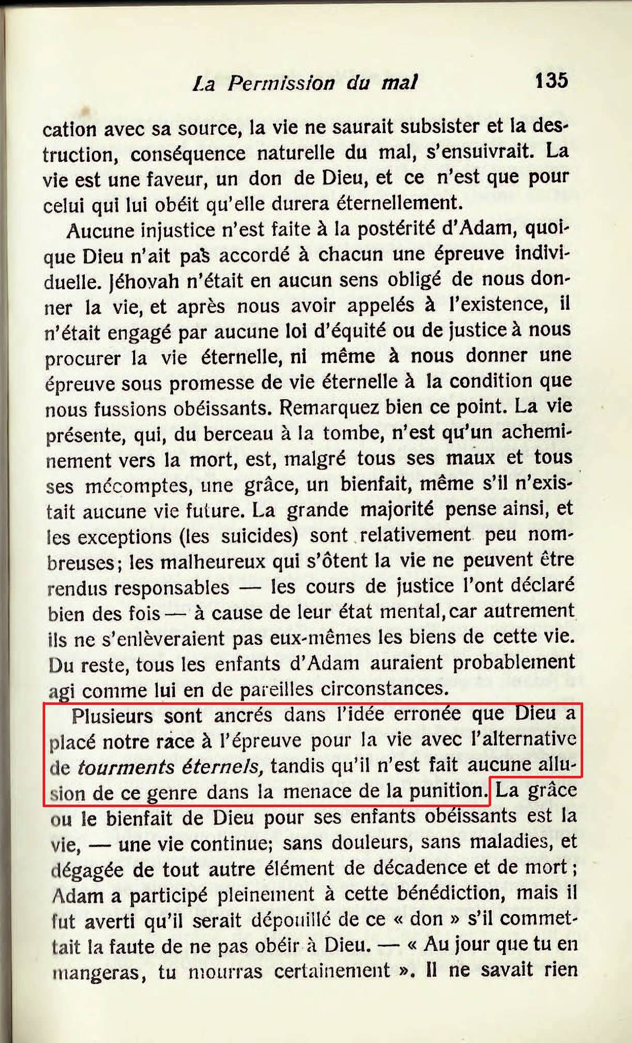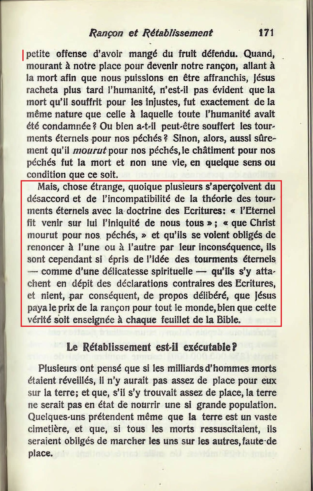 « [...] la mort qui vient par suite d'une apostasie individuelle, volontaire, est définitive pour toujours. Pour ce ce péché il n'y a point de rémission et son châtiment, la seconde mort, sera éternel, - ce ne sera pas l'état de mourir éternellement , mais une mort éternelle qui dure à toujours, sans être interrompue par une résurrection. [...] nul ne peut apprécier cette preuve de l'Ecriture, s'il n'admet la doctrine scripturaire que la mort - l'extinction de l'existence , - est le salaire du péché. Celui qui se figure la mort comme une vie de tourments ne se fait pas seulement une fausse idée de la signification des mots mort et vie , mais il s'engage aussi dans deux absurdités. Il est absurde de supposer que Dieu perpétuerait à toujours l'existence d'Adam dans les tourments pour un péché quelconque , spécialement pour la petite offense d'avoir mangé du fruit défendu. [...] Mais chose étrange, quoique plusieurs s'aperçoivent du désaccord et de l'incompatibilité de la théorie des tourments éternels avec la doctrine des Ecritures : "l'Eternel fit venir sur lui l'iniquité de nous tous", "que Christ mourut pour nos péchés," et qu'ils se voient obligés de renoncer à l'une ou à l'autre par leur inconséquences, ils sont cependant si épris de l'idée des tourments éternels - comme d'une délicatesse spirituelle - qu'ils s'y attachent en dépit des déclarations contraires des Ecritures, et nient, par conséquent, de propos délibéré, que Jésus paya le prix de la rançon pour tout le monde, bien que cette vérité soit enseignée à chaque feuillet de la Bible. »