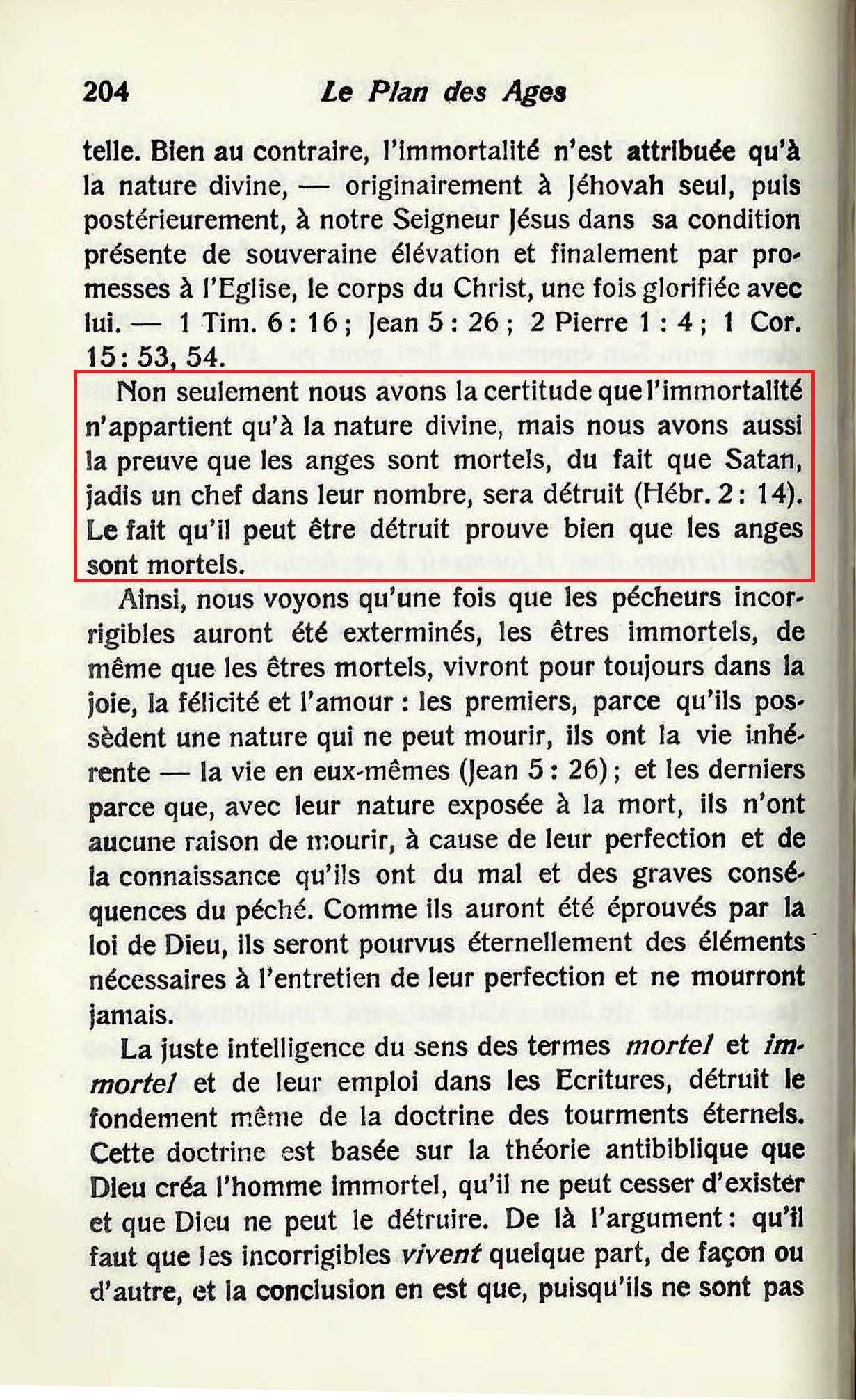 « Non seulement nous avons la certitude que l'immortalité n'appartient qu'à la nature divine, mais nous avons aussi la preuve que les anges sont mortels , du fait que Satan , jadis un chef dans leur nombre, sera détruit (Hébr. 2:14). Le fait qu'il peut être détruit prouve bien que les anges sont mortels. [...] La juste intelligence du sens des termes mortel et immortel et de leur emploi dans les Ecritures, détruit le fondement même de la doctrine des tourments éternels. Cette doctrine est basée sur la théorie antibiblique que Dieu créa l'homme immortel, qu'il ne peut cesser d'exister et que Dieu ne peut le détruire. »