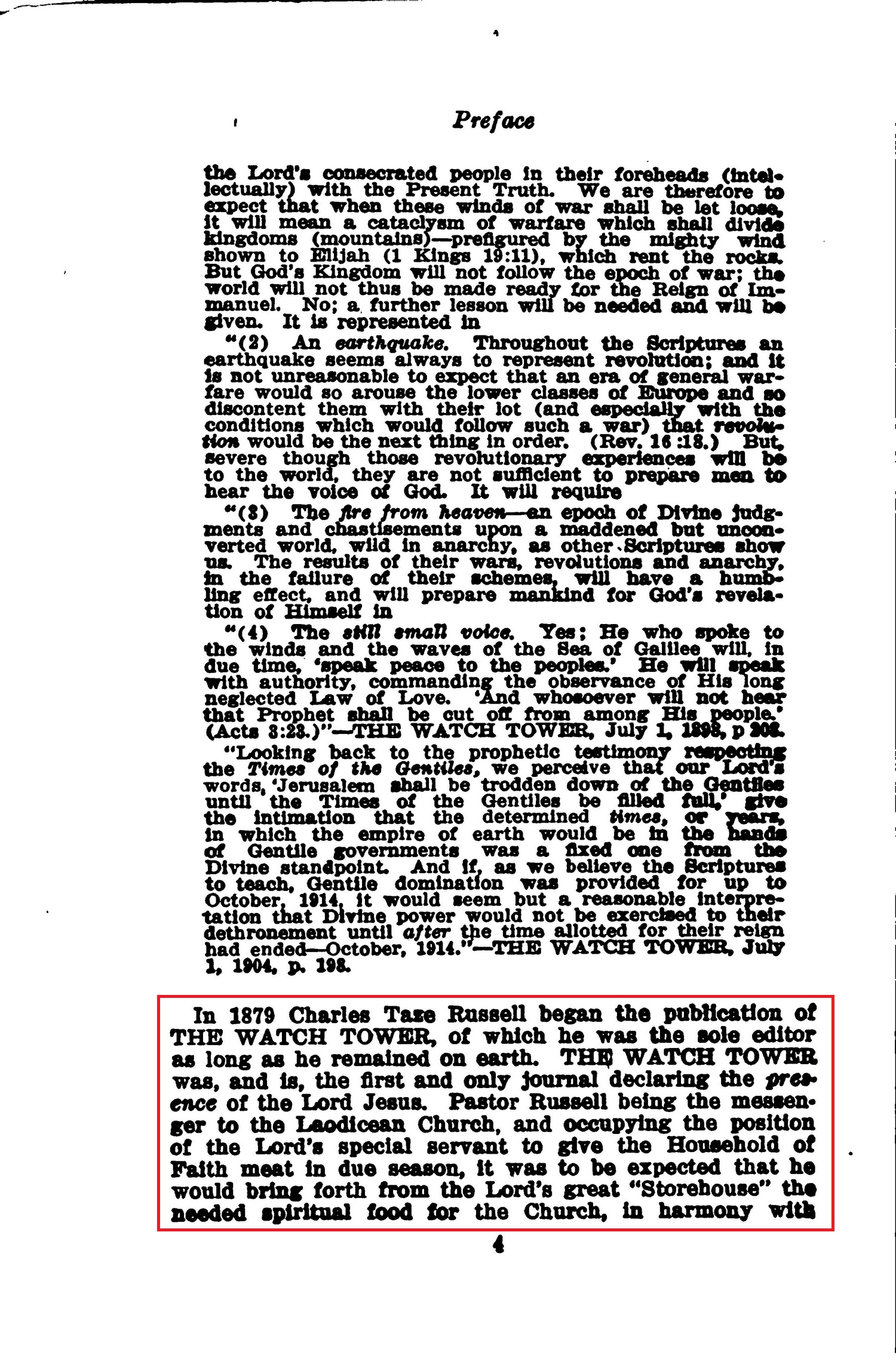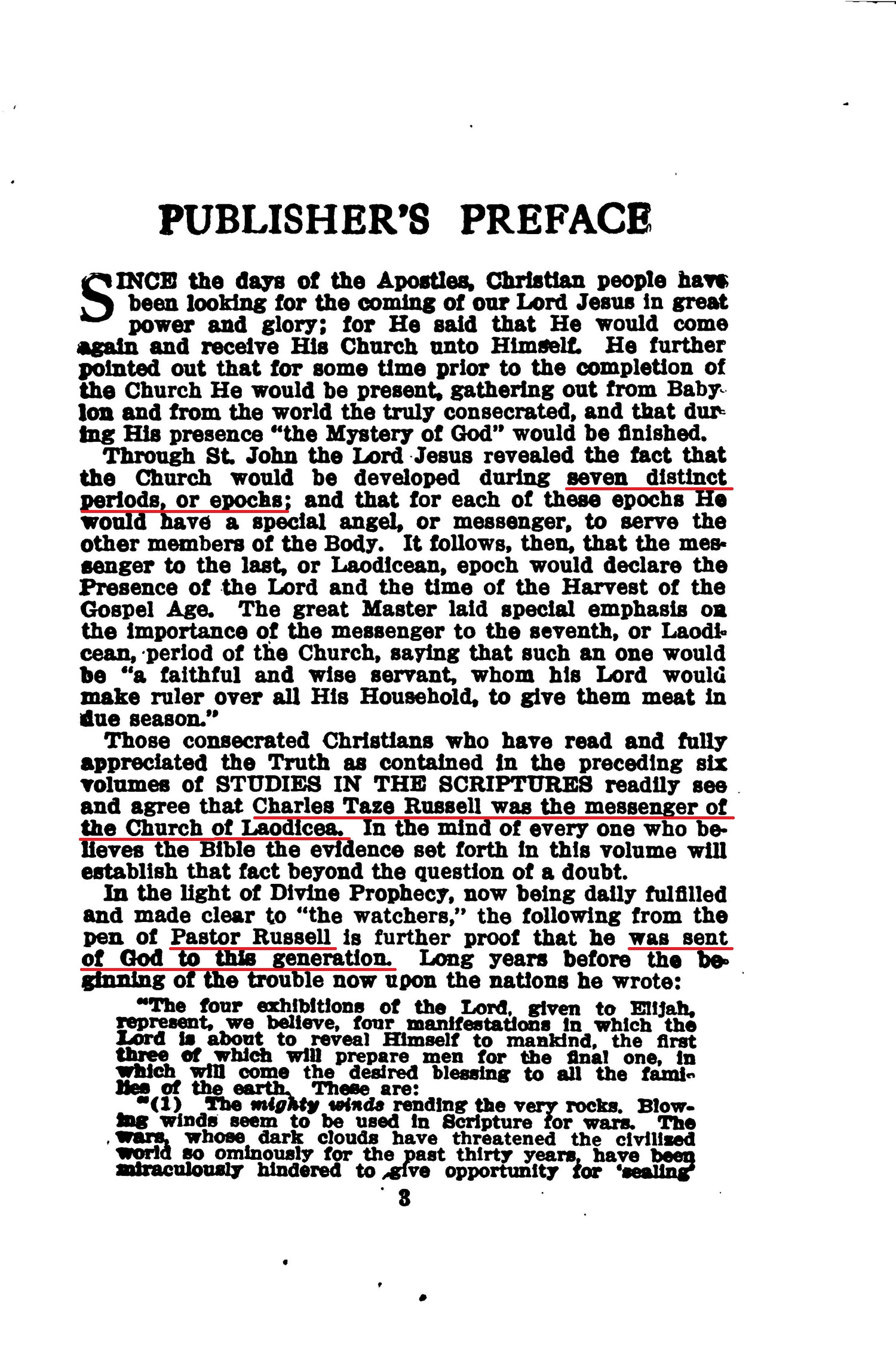 « Through St John the Lord Jesus revealed the fact that the Church would be developed during seven distinct periods, or epochs ; and that for each of these epochs He would have a special angel, or messenger , to serve the other members of the Body. It follows, then, that the messenger to the last, or Laodicean , epoch would declare the Presence of the Lord and the time of the Harvest of the Gospel Age. The great Master laid special emphasis on the Importance of the messenger to the seventh, or Laodicean , period of the Church, saying that such an one would be "a faithful and wise servant, whom his Lord would make ruler over all His Household, to give them meat In due season." Those consecrated Christians who have read and fully appreciated the Truth as contained In the preceding six volumes of STUDIES IN THE SCRIPTURES readily see and agree that Charles Taze Russell was the messenger of the Church of Laodicea. In the mind of every one who believes the Bible the evidence set forth In this volume will establish that fact beyond the question of a doubt. In the light of Divine Prophecy, now being dally fulfilled and made clear to "the watchers," the following from the pen of Pastor Russell is further proof that he was sent of God to this generation. »