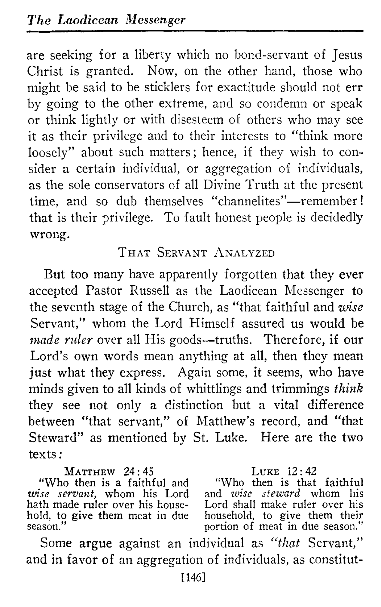 Mais trop de gens ont apparemment oublié qu'ils ont jamais accepté le pasteur Russell comme le messager de Laodicée au septième stade de l'Église , comme « ce serviteur fidèle et sage », dont le Seigneur lui-même nous a assuré qu'il serait fait régner sur toutes ses bonnes vérités.