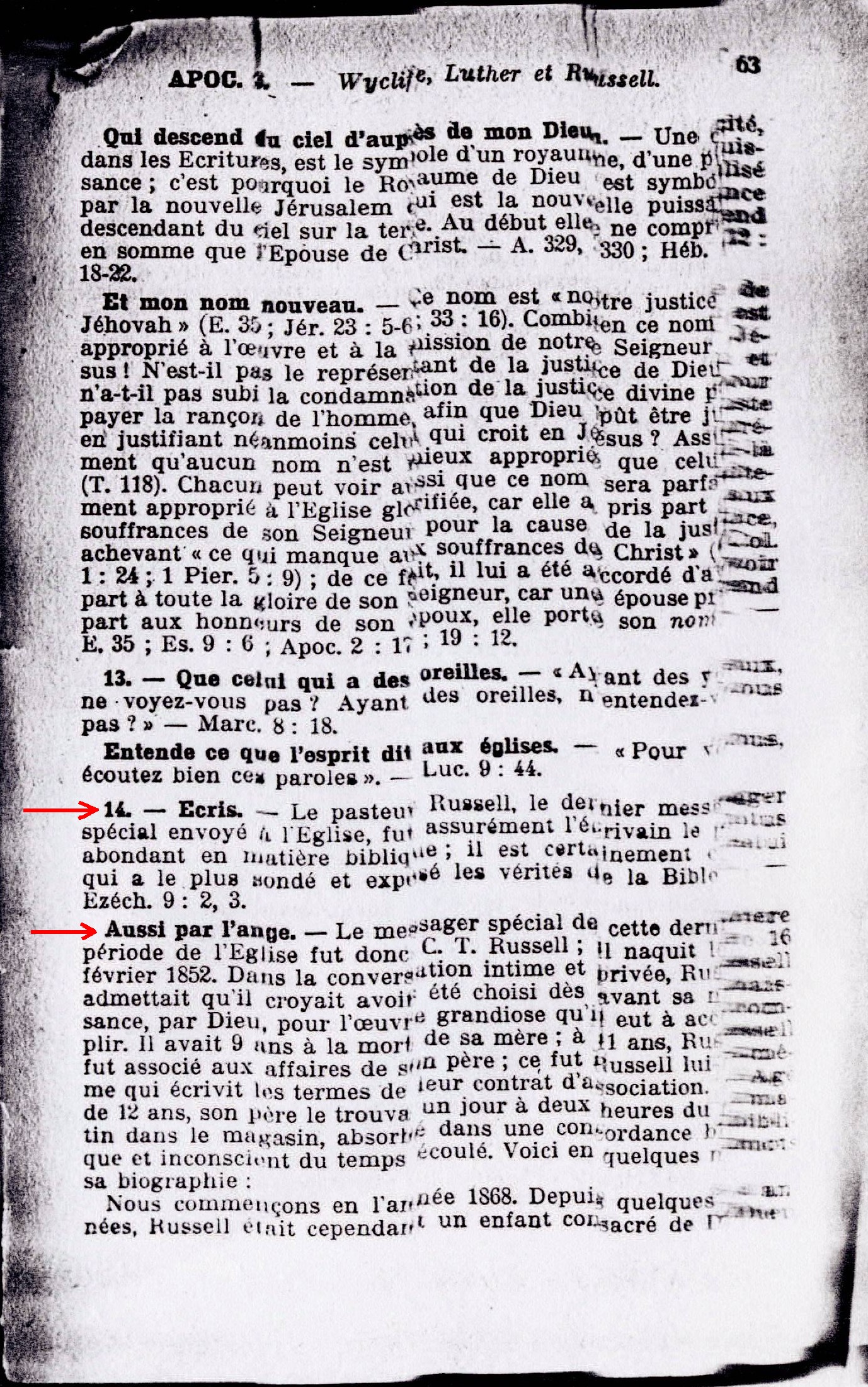 Aussi par l'ange . - Le messager spécial de cette dernière période de l'Eglise fut donc C.T. Russell ... Dans la conversation intime et privée, Russell admettait qu'il croyait avoir été choisi dès avant sa naissance, par Dieu, pour l'oeuvre grandiose qu'il eut à accomplir. »
