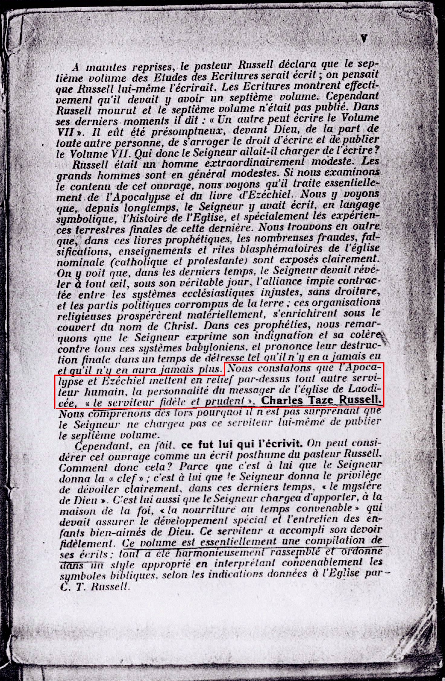 « En 1879, Charles Taze Russell commença la publication de la Tour de Garde, dont il fut le seul rédacteur-directeur jusqu'à sa mort. La Tour de garde est le premier et le seul journal annonçant la présence de notre Seigneur Jésus. Le pasteur Russell fut le messager ou l'ange de l'Eglise de Laodicée : il fut donc le serviteur spécial de Dieu qui devait apportait à la maison de la foi "la nourriture au temps convenable". [...] Par la grâce du Seigneur, Russell écrivit les six volumes des Etudes des Ecritures, |...] Ces volumes ont été destinés à être des "clefs pour ouvrir le divin plan des âges »