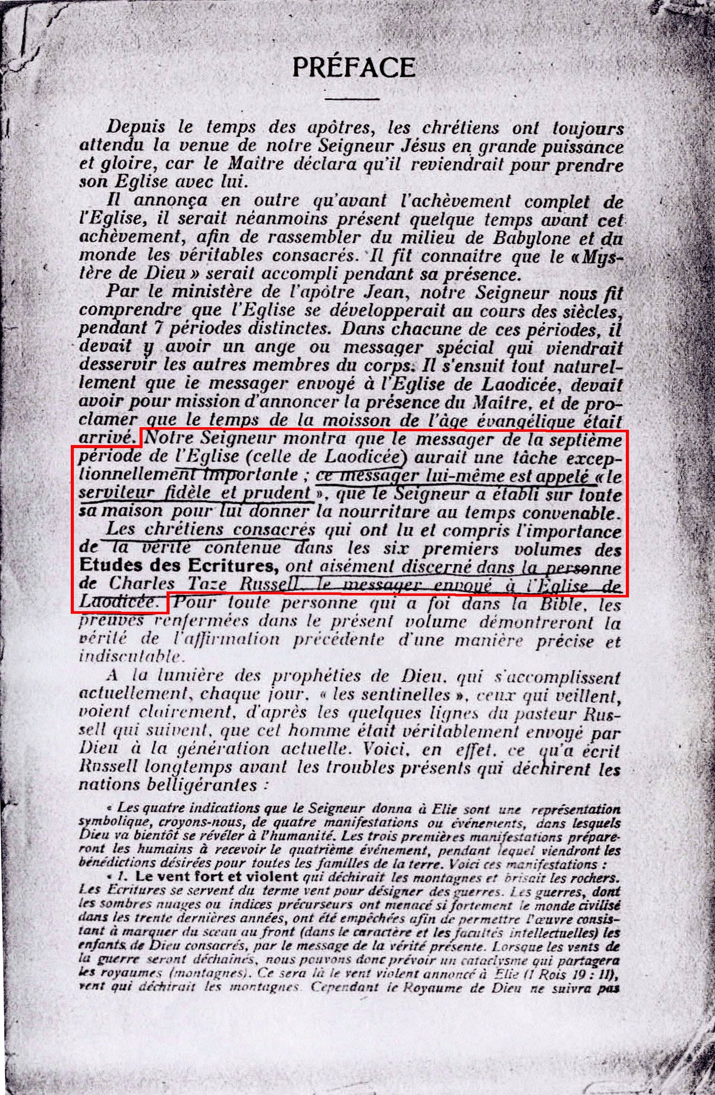 « Notre Seigneur montra que le messager de la septième période de l'Eglise (celle de Laodicée) aurait une tâche exceptionnelle importante : ce messager lui-même est appelé "le serviteur fidèle et prudent", que le Seigneur a établi sur toute sa maison pour lui donner la nourriture au temps convenable [...] les chrétiens consacrés [...] ont aisément discerné dans la personne de Charles Taze Russell le messager envoyé à l'Eglise de Laodicée [...] cet homme était véritablement envoyé par Dieu à la génération actuelle »