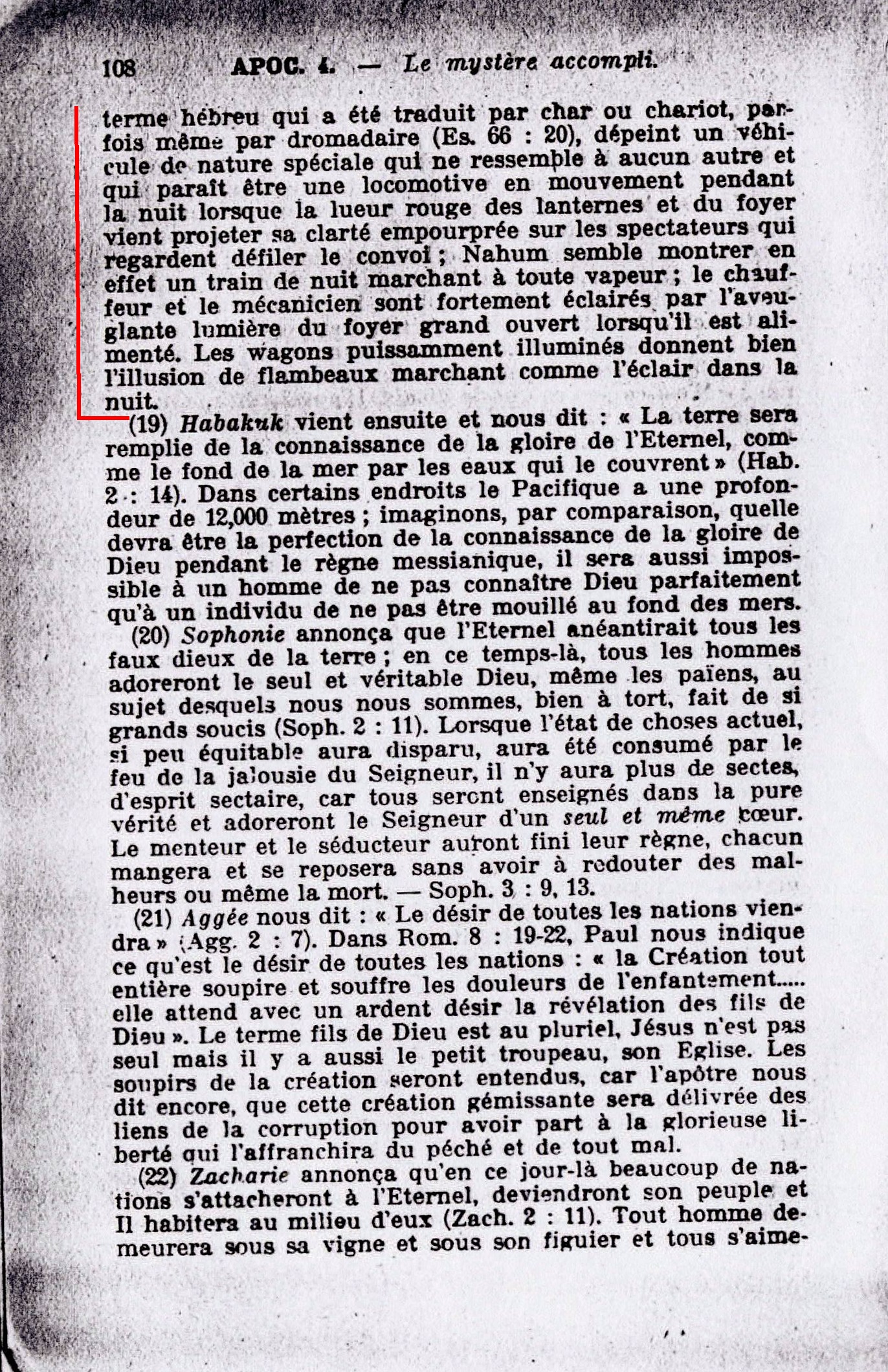 « ...Nahum prophétisa , ... dans son chapitre 2, versets 4 et 5 il nous montre un événement, une réalité qui existera au temps de Royaume; il parle visiblement en termes très imagés d'un train à vapeur en marche ; le terme hébreu qui a été traduit par char ou chariot, parfois même âr dromadaire (Es. 66:20), dépeint un véhicule de nature spéciale qui ne ressemble à aucun autre et qui paraît être une locomotive en mouvement pendant la nuit lorsque la lueur rouge des lanternes et du foyer vient projeter sa clarté empourprée sur les spectateurs qui regardent défiler le convoi; Nahum semble montrer en effet un train de nuit marchant à toute vapeur ; le chauffeur et le mécanicien sont fortement éclairés par l'aveuglante lumière du foyer grand ouvert lorsqu'il est alimenté. Les wagons puissamment illuminés donnent bien l'illusion de flambeaux marchant comme l'éclair dans la nuit. »