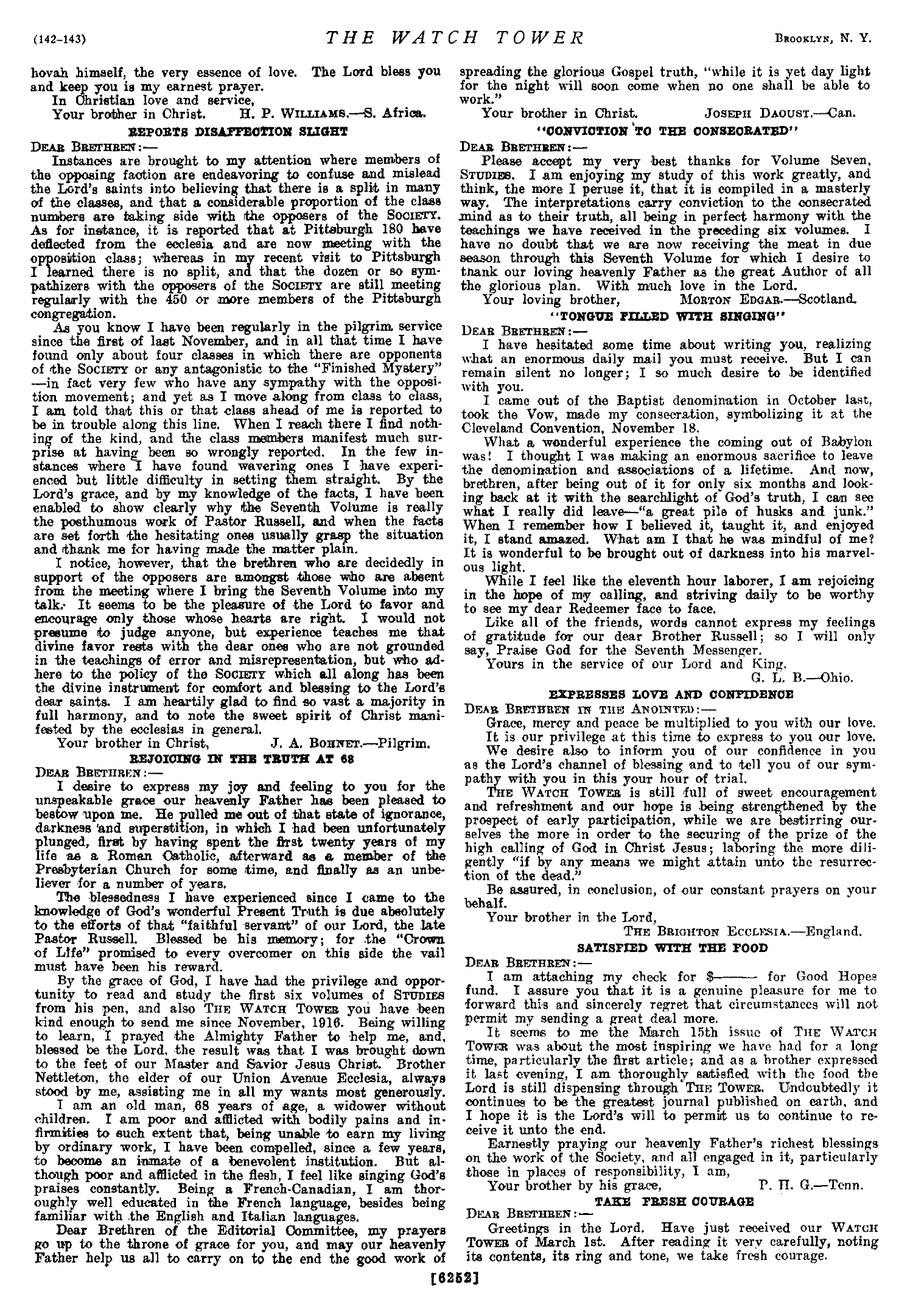 « Like all of the friends, words cannot express my feelings of gratitude for our dear Brother Russell ; so I will only say, Praise God for the Seventh Messenger. »