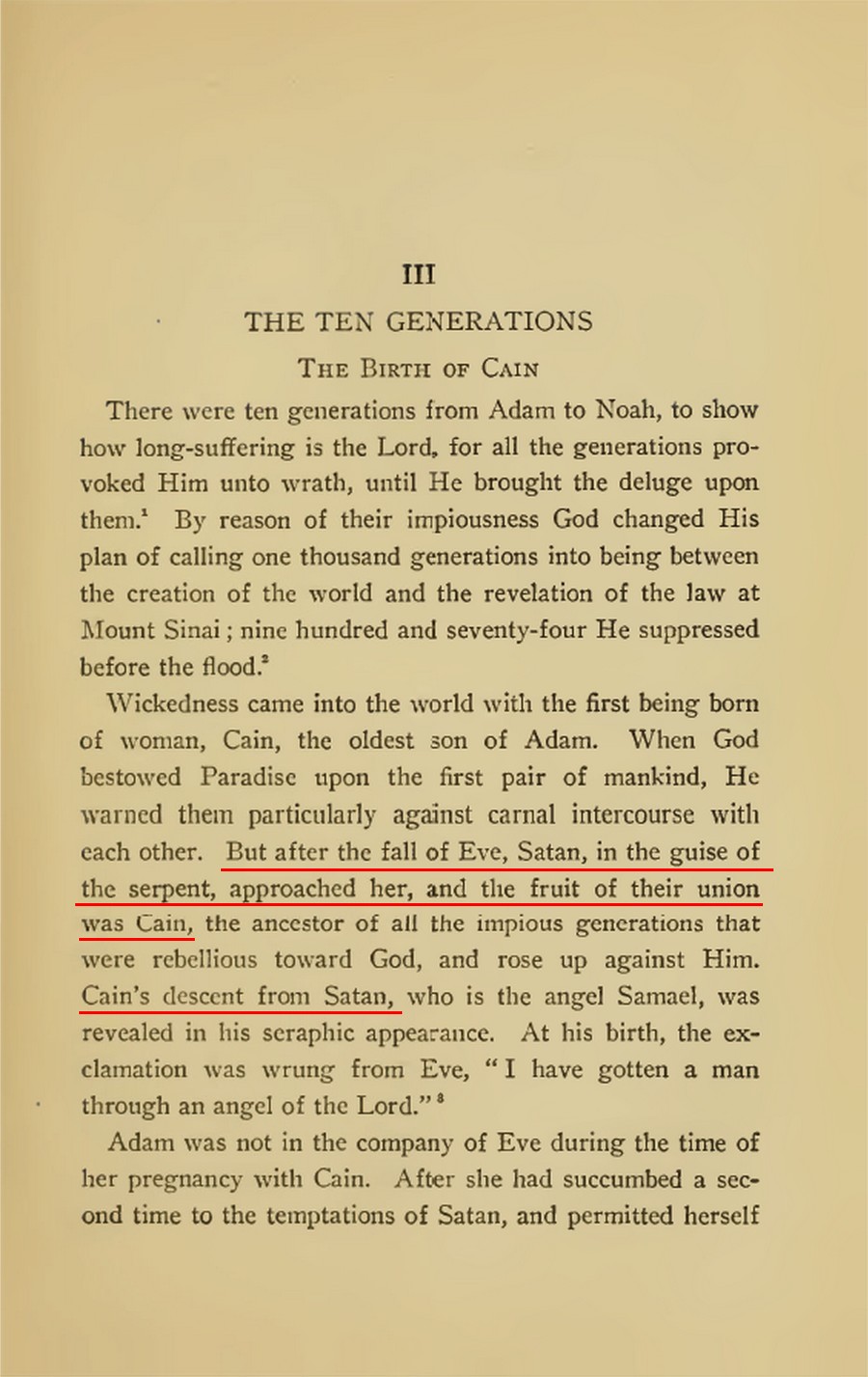 « Deux êtres [Adam et Na’hash] eurent des rapports avec Ève [la seconde femme], et elle conçut des deux et porta deux enfants… D’un côté, Caïn est l’hôte de toutes les espèces du mal ; du côté d’Abel vient une espèce plus miséricordieuse, bien que non encore parfaite — du bon vin mélangé avec du mauvais. »
