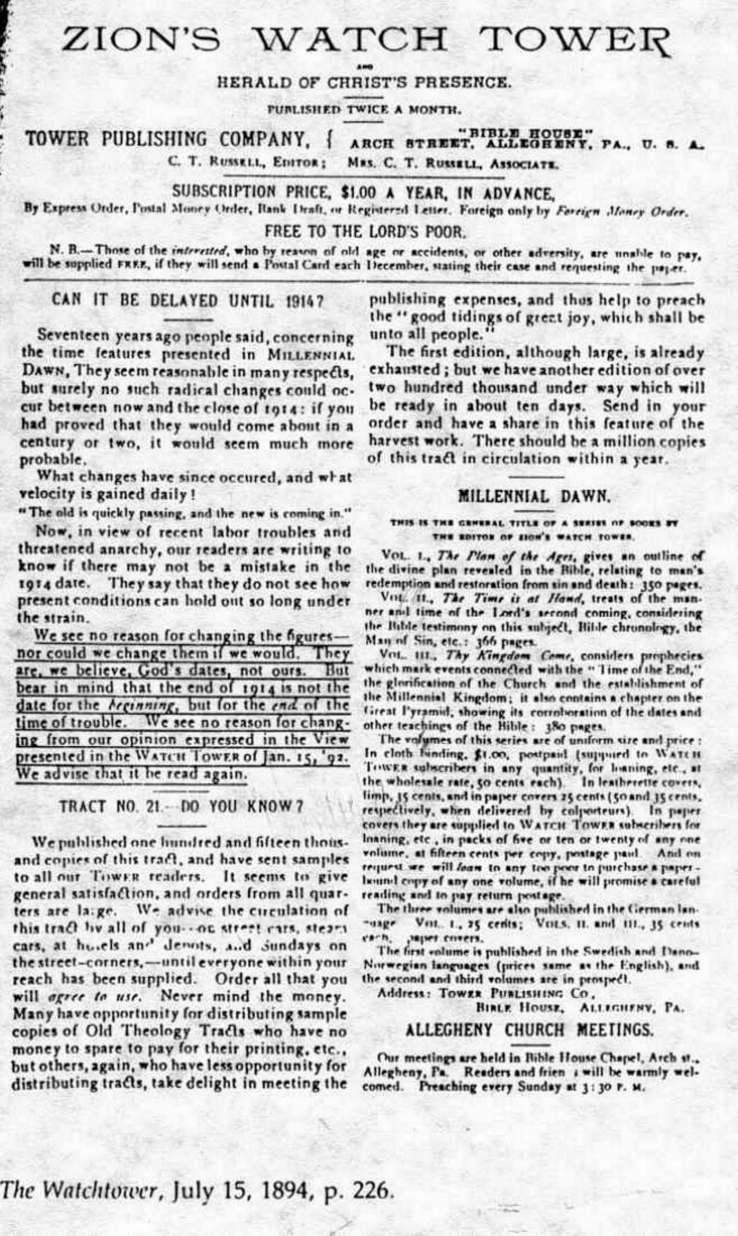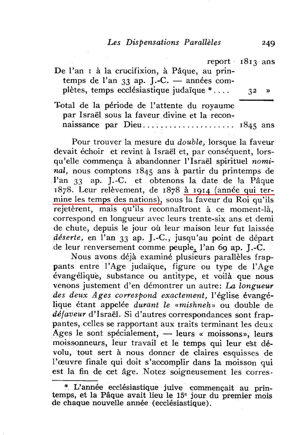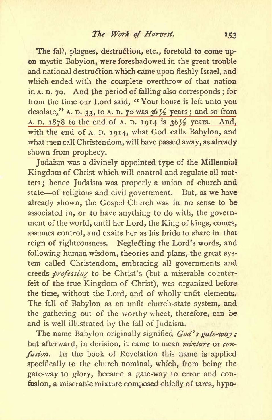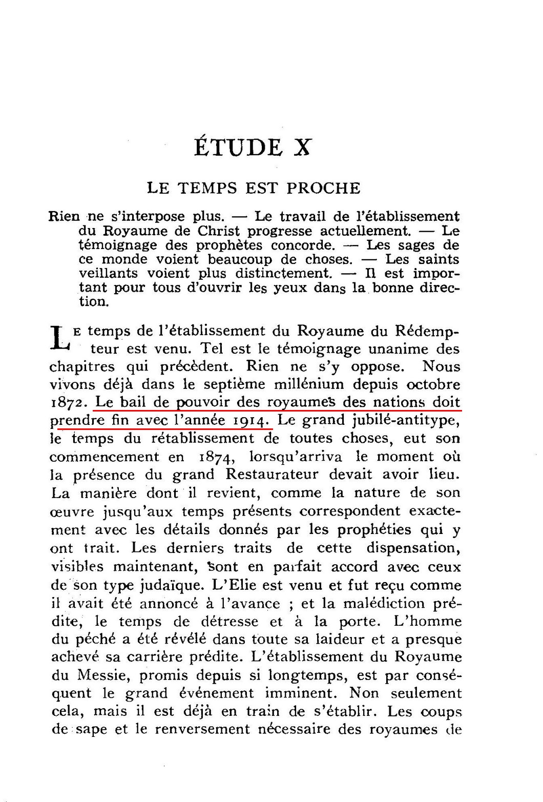 1914 est effectivement le fondement et le sommet de tous enseignements eschatologiques de Russell. Pendant quarante ans, il a prêché avec beaucoup de conviction et de zèle qu'en 1914 aurait lieu la fin du monde. Ce qu'il affirme à propos de 1914 et les autres dates ne sont pas des évantualités ou des probabilités mais des choses sûres et certaines. La chronologie que Russell présente n'est pas humaine mais divine. Voici ce qu'il dit à ce propos en 1894 :